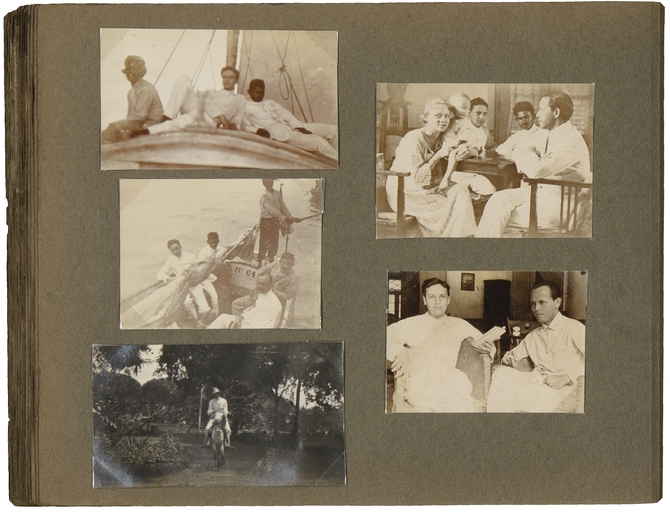 ![]() Linksboven: E. du Perron op voorplecht van een boot (op achterzijde: Bij eiland Raës 28 Maart ’20) Linksmidden: (op achterzijde: Bij Kalisangka 18 Maart ’20) Linksonder: E. du Perron Rechtsboven: Jane Beynon, zoontje, E. du Perron, dokter Fanggideaj, Paul Beynon Rechtsonder: E. du Perron en Paul Beynon (op achterzijde: Ardjasa 22 Maart ’20) |