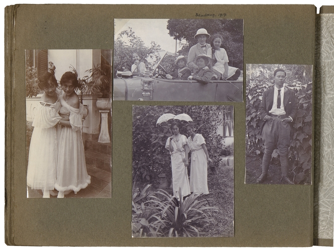 Midden boven: jongeren in een Panhard. Het meisje dat met haar arm op de auto rust is waarschijnlijk Julie van Lennep, de jongeman met de tropenhelm is H.C. (Henk) Buurman