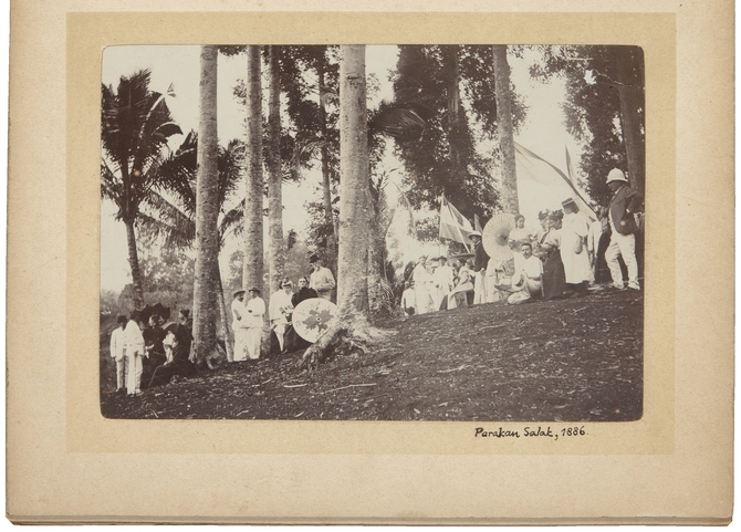 Tuinfeest op theeonderneming Parakan Salak. Charles Emile du Perron hurkend met een trom. (Zie E. du Perron. Het leven van een smalle mens, p. 33)