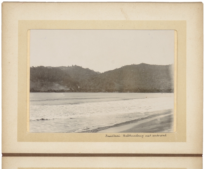 De Zandbaai aan de zuidkust, waar Charles du Perron een rijstpellerij begon. De waterval heet Tjimarindjoeng (tji = water) (op achterzijde: waterval Jimarindjoeng gericht op kampong)