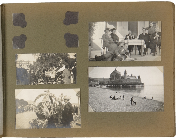 ![]() Rechtsboven: La Lanterne, hôtel-restaurant te Nice, diner met Lucien Paul Bédier de Prairie, een oudere broer van Madeline du Perron, zijn echtgenote Louise Caroline Lucassen en hun zoon Paul (op achterzijde: La Lanterne, Nice) Rechtsonder: E. du Perron met de hond van zijn neef op het strand van Nice, naast de Promenade des Anglais Linksboven: E. du Perron Linksonder: mogelijk neef Paul |