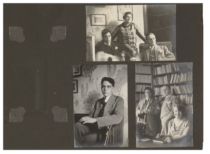 ![]() Rechtsboven: Pedro Creixams (links) en zijn vrouw Madeleine, in het appartement van Du Perron, Bellevuestraat 3, Brussel, (op achterzijde: Sept. ’25) Linksonder: Pascal Pia logeert een week in Bellevuestraat 3, september 1925 Rechtsonder: v.l.n.r. Pedro Creixams, de erudiete Brusselse boekhandelaar Raoul Simonson en mogelijk diens echtgenote |
