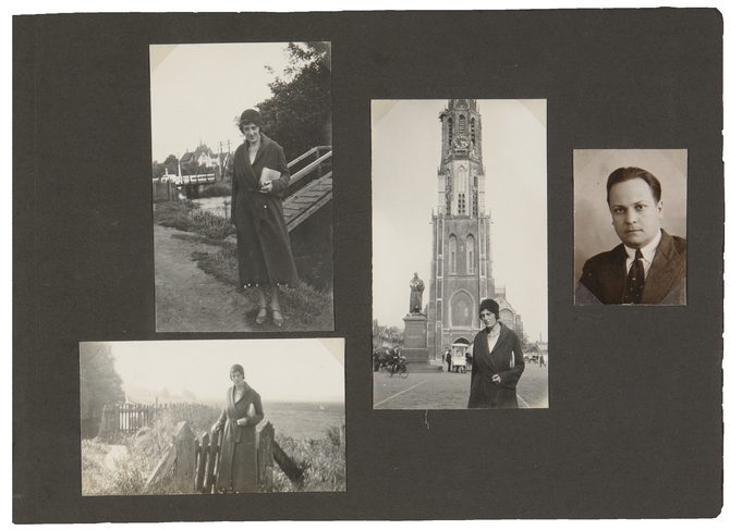 Links en midden: Elisabeth de Roos. In het midden: op de Markt van Delft bij de Nieuwe Kerk en het standbeeld van Hugo de Groot