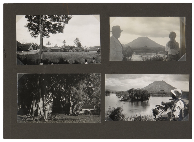 ![]() Linksonder: Elisabeth de Roos in de tuin van Hotel Papandajan, Garoet Rechtsboven: E. du Perron, Elisabeth de Roos en Alain bij het Meer van Leles Rechtsonder: Sitoe Tjangkoewang oftewel Meer van Leles, op de hoogvlakte van Garoet. In het meer ligt het eilandje Salem, waar aan het einde van De stille kracht van Louis Couperus de oud-resident Van Oudijck zich heeft teruggetrokken |