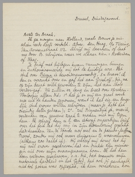 Ik ga morgen naar Holland, zooals Bouws je misschien reeds heeft verteld. Adres: Den Haag, c/o Tissing, Van Aerssenstraat 113. Schrijf mij daarheen of laat me door B. schrijven waar we elkaar zien: Rotterdam of Haag.