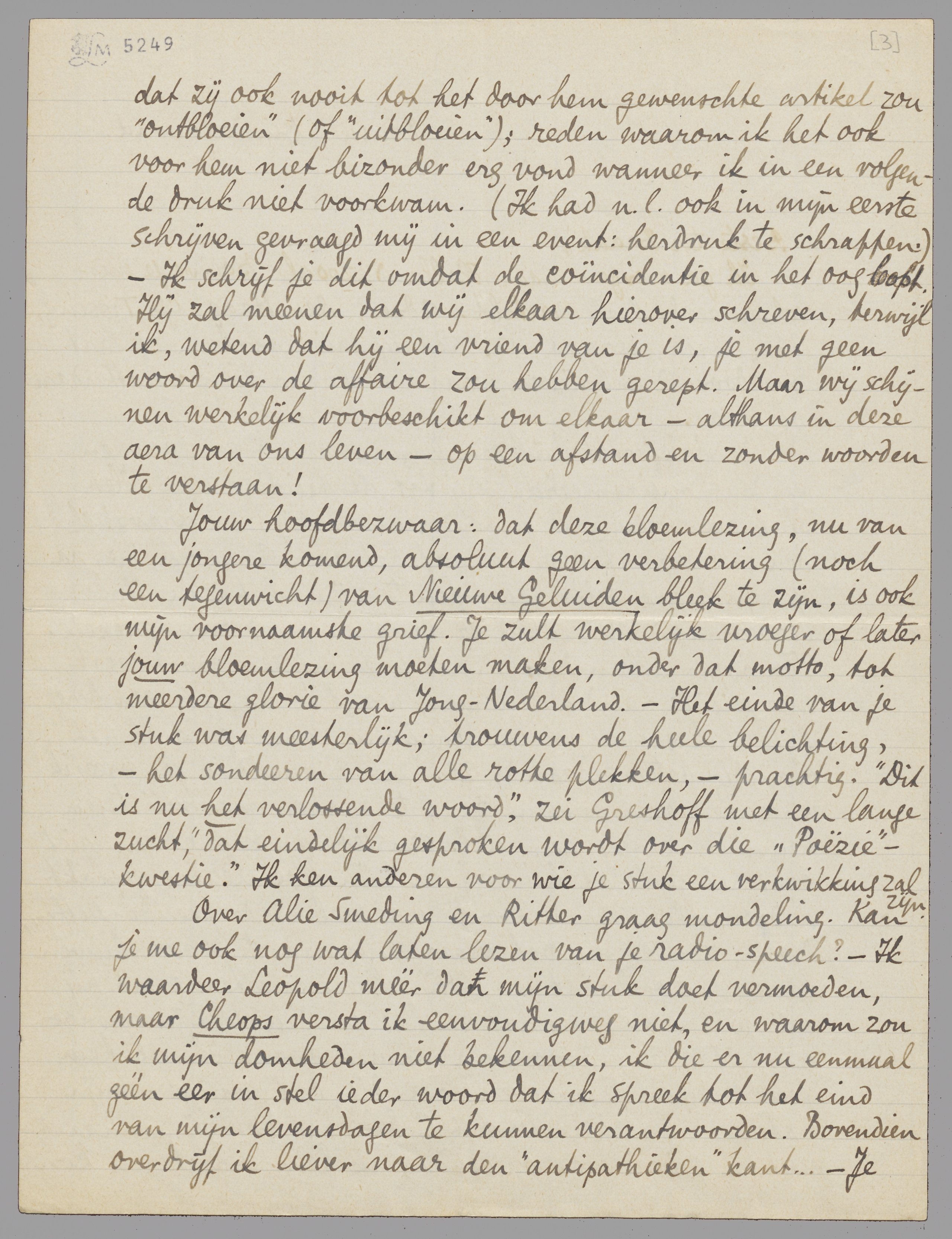 Jouw hoofdbezwaar: dat deze bloemlezing, nu van een jongere komend, absoluut geen verbetering (noch een tegenwicht) van Nieuwe Geluiden bleek te zijn, is ook mijn voornaamste grief. Je zult werkelijk vroeger of later jouw bloemlezing moeten maken, onder dat motto, tot meerdere glorie van Jong-Nederland. - Het einde van je stuk was meesterlijk; trouwens de heele belichting, - het sondeeren van alle rotte plekken, - prachtig. ‘Dit is nu het verlossende woord’, zei Greshoff met een lange zucht, ‘dat eindelijk gesproken wordt over die ‘Poëzie’-kwestie’. Ik ken anderen voor wie je stuk een verkwikking zal zijn.
