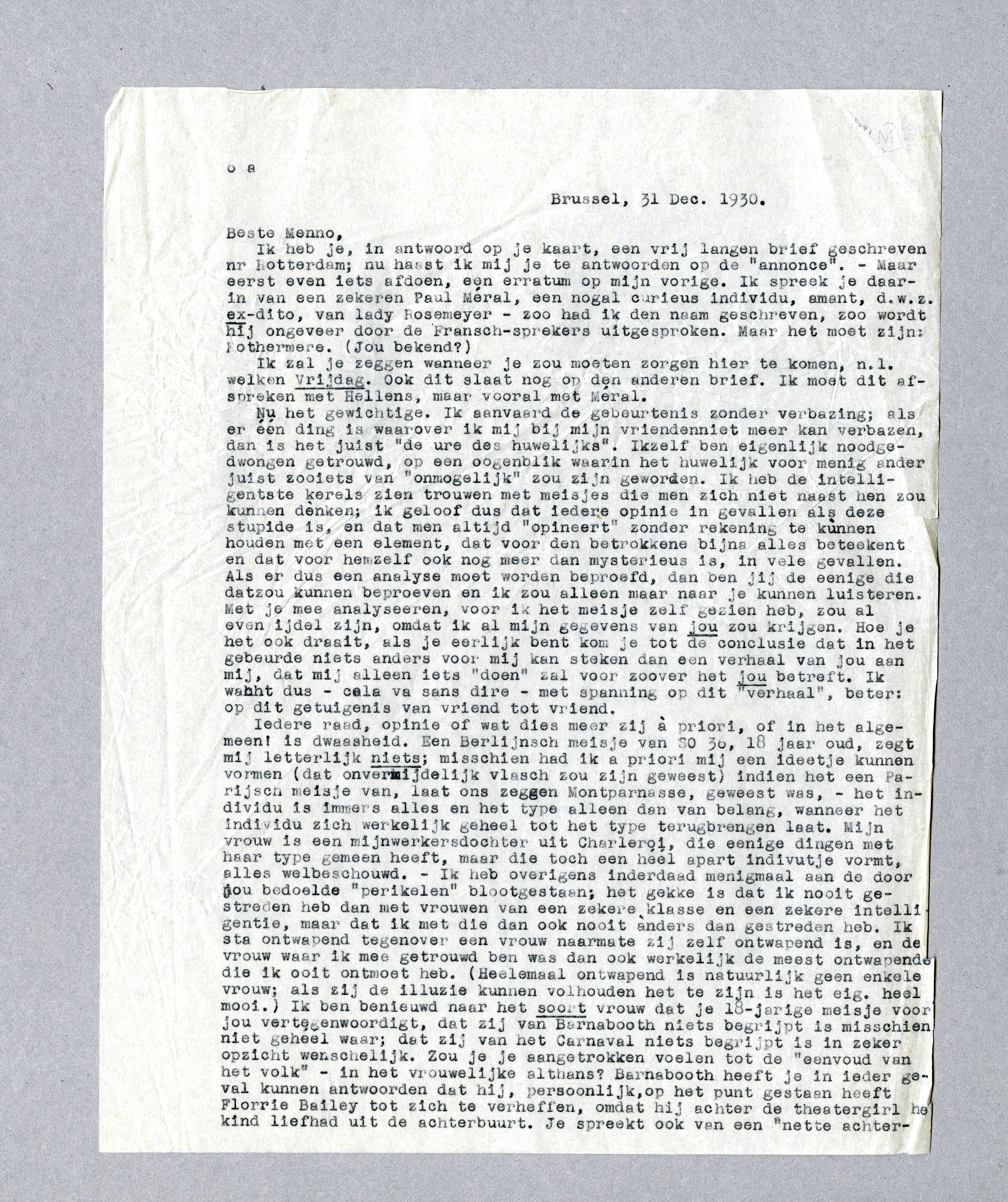Nu het gewichtige. Ik aanvaard de gebeurtenis zonder verbazing; als er één ding is waarover ik mij bij mijn vrienden niet meer kan verbazen, dan is het juist ‘de ure des huwelijks’. Ikzelf ben eigenlijk noodgedwongen getrouwd, op een oogenblik waarin het huwelijk voor menig ander juist zooiets van ‘onmogelijk’ zou zijn geworden. Ik heb de intelligentste kerels zien trouwen met meisjes die men zich niet naast hen zou kunnen dènken; ik geloof dus dat iedere opinie in gevallen als deze stupide is, en dat men altijd ‘opineert’ zonder rekening te kùnnen houden met een element, dat voor den betrokkene bijna alles beteekent en dat voor hemzelf ook nog meer dan mysterieus is, in vele gevallen. Als er dus een analyse moet worden beproefd, dan ben jij de eenige die dat zou kunnen beproeven en ik zou alleen maar naar je kunnen luisteren. Met je mee analyseeren, voor ik het meisje zelf gezien heb, zou al even ijdel zijn, omdat ik al mijn gegevens van jou zou krijgen. Hoe je het ook draait, als je eerlijk bent kom je tot de conclusie dat in het gebeurde niets anders voor mij kan steken dan een verhaal van jou aan mij, dat mij alleen iets ‘doen’ zal voor zoover het jou betreft. Ik wacht dus - cela va sans dire - met spanning op dit ‘verhaal’, beter: op dit getuigenis van vriend tot vriend.