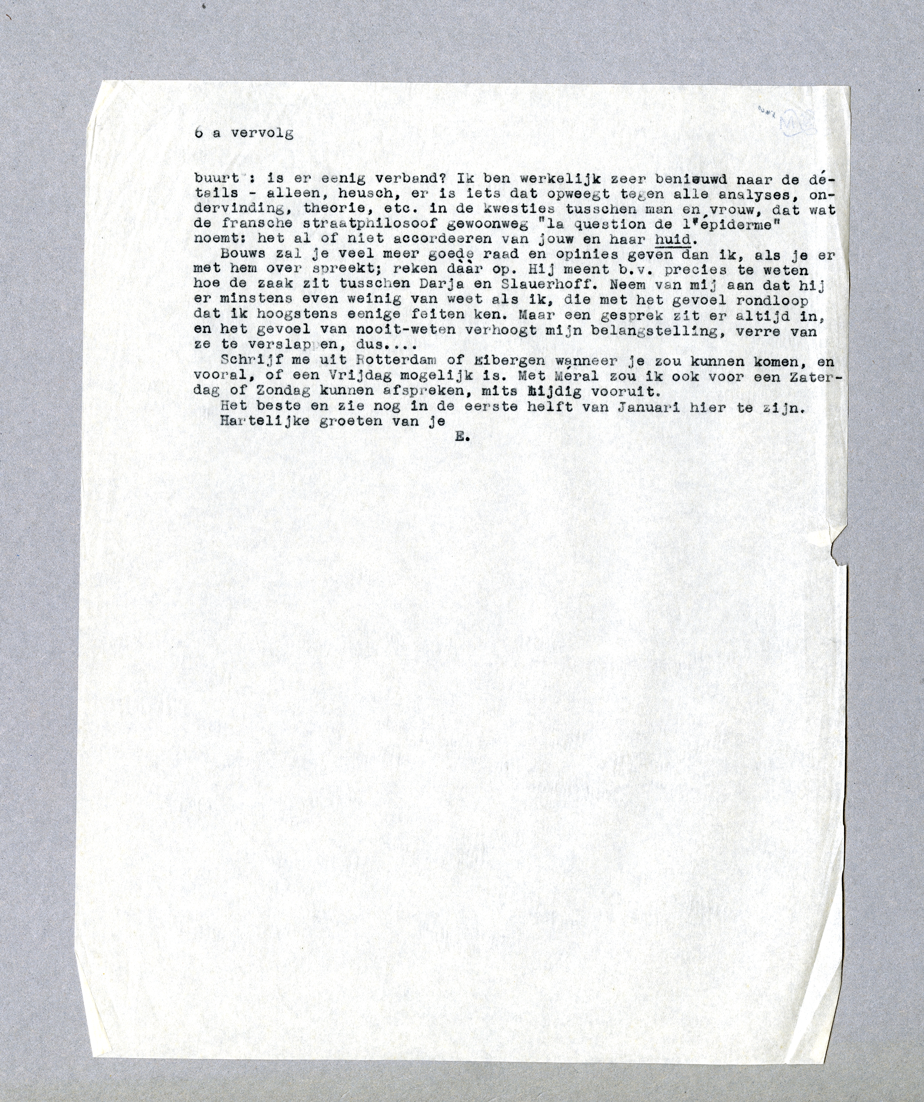 Zou je je aangetrokken voelen tot de ‘eenvoud van het volk’ - in het vrouwelijke althans? Barnabooth heeft je in ieder geval kunnen antwoorden dat hij, persoonlijk, op het punt heeft gestaan Florrie Bailey tot zich te verheffen, omdat hij achter de theatergirl het kind liefhad uit de achterbuurt. Je spreekt ook van een ‘nette achterbuurt’: is er eenig verband? Ik ben werkelijk zeer benieuwd naar de détails - alleen, heusch, er is iets dat opweegt tegen alle analyses, ondervinding, theorie, etc. in de kwesties tusschen man en vrouw, dat wat de fransche straat-philosoof gewoonweg ‘la question de l'épiderme’ noemt: het al of niet accordeeren van jouw en haar huid.