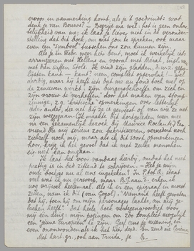 Ik laat het voor vandaag hierbij, omdat het niet prettig is in bed zittend te schrijven. - Heb je mijn oude boekjes nu al eens ingekeken? In P. tot A. staat veel wat ik nu verwerp, maar B.G. aan E. erken ik nog vrijwel heelemaal. Als ik er een epigraaf in moest zetten, nam ik dit (van Gogol): ‘Niemand heeft geweten dat hij, toen hij om mijn personages lachte, om mij gelachen heeft’. Dat heele boek vertegenwoordigt voor mij één ding: mijn pogingen om zoo kompleet mogelijk een ‘jeune Européen’ te zijn. Geef eens je meening, en even onomwonden als ik het hier deed. En zend me Cinema.