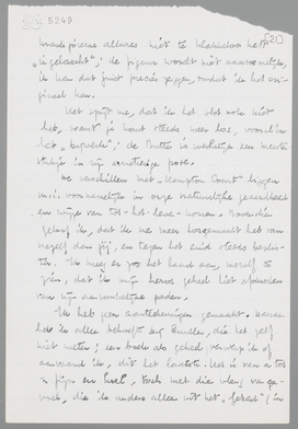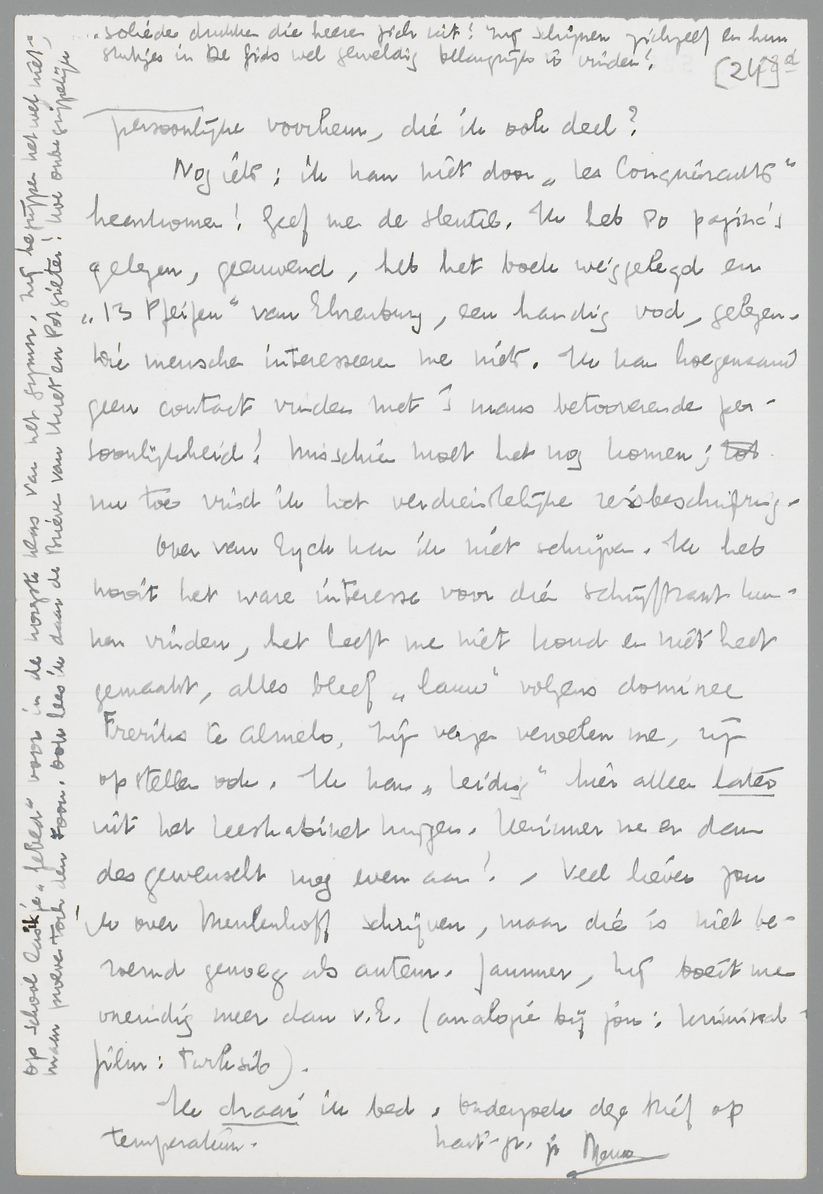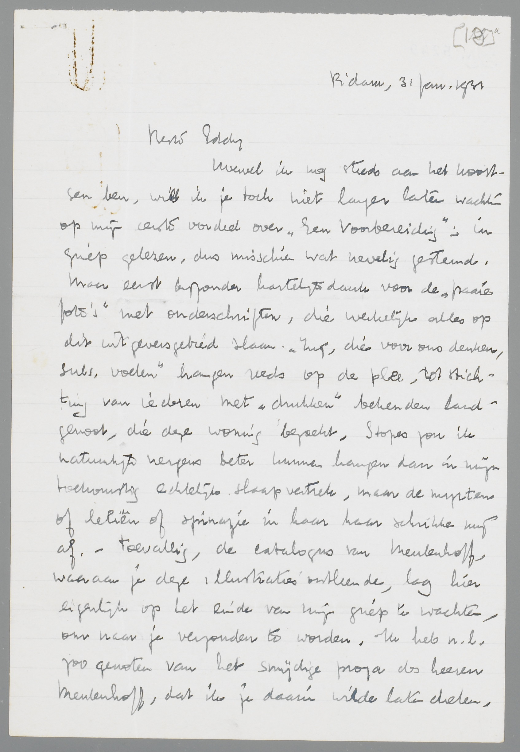 Hoewel ik nog steeds aan het koortsen ben, wil ik je toch niet langer laten wachten op mijn eerste oordeel over Een Voorbereiding; in griep gelezen, dus misschien wat nevelig gestemd. Maar eerst bijzonder hartelijk dank voor de ‘fraaie foto's’ met onderschriften, die werkelijk alles op dit uitgeversgebied slaan. ‘Zij, die voor ons denken, subs. voelen’ hangen reeds op de plee, tot stichting van iederen met ‘drukken’ bekenden landgenoot, die deze woning bezoekt. Stopes zou ik natuurlijk nergens beter kunnen hangen dan in mijn toekomstig echtelijk slaapvertrek, maar de myrten of leliën of spinazie in haar haar schrikken mij af. - Toevallig, de catalogus van Meulenhoff, waaraan je deze illustraties ontleende, lag hier eigenlijk op het einde van mijn griep te wachten, om naar je verzonden te worden. Ik heb n.l. zoo genoten van het snijdige proza des heeren Meulenhoff, dat ik je daarin wilde laten deelen. Het is dus niet noodig, en je hebt natuurlijk zelf al gelezen, aan wat voor fielten wij in het algemeen zijn overgeleverd, dat wij met Stols en van Loghum onze handen mogen dichtknijpen! Maar de naïeve schaamteloosheid van dien ouden druif is zoo kostelijk! Ik geef om zulk proza werkelijk meer dan om vijf volzinnen van Helman; zij versluieren immers niets, zijn volkomen oprecht en hartelijk eenvoudig.