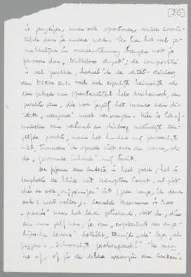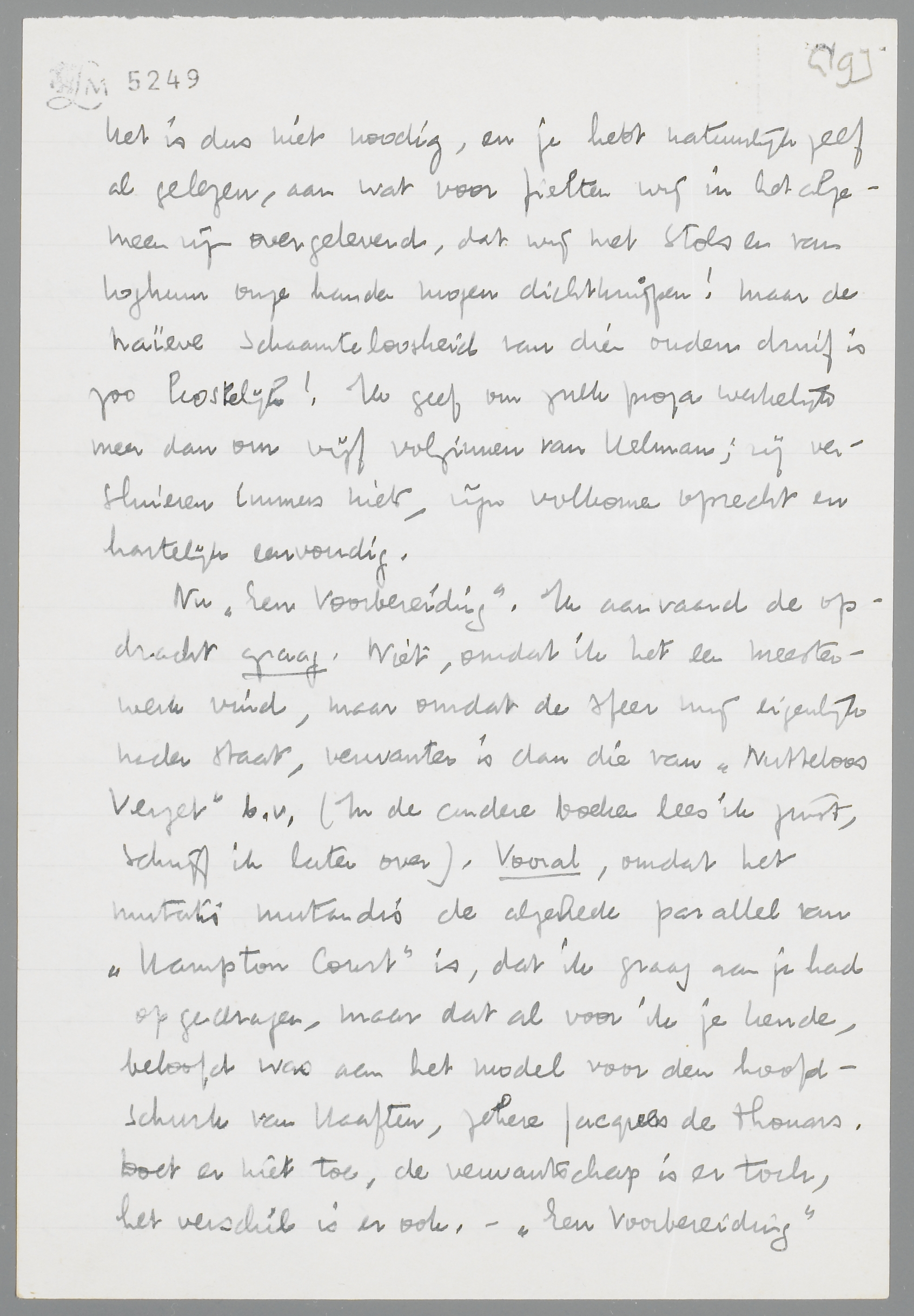 Nu Een Voorbereiding. Ik aanvaard de opdracht graag. Niet, omdat ik het een meesterwerk vind, maar omdat de sfeer mij eigenlijk nader staat, verwanter is dan die van Nutteloos Verzet b.v. (In de andere boeken lees ik juist, schrijf ik later over). Vooral, omdat het mutatis mutandis de algeheele parallel van Hampton Court is, dat ik graag aan je had opgedragen, maar dat al voor ik je kende, beloofd was aan het model voor den hoofdschurk van Haaften, zekere Jacques de Thouars. Doet er niet toe, de verwantschap is er toch, het verschil is er ook. - Een Voorbereiding is jeugdiger, maar ook spontaner, minder casuïstisch dan je andere werk. Ik kan het veel gemakkelijker in overeenstemming brengen met je persoon dan Nutteloos Verzet; de compositie is veel zwakker, hoewel ik de vertel-dialoog van Oscar c.s. toch ook eigenlijk heimelijk als een gesprek aan spontanïteit heb beschouwd, een zwakte dus, die voor jezelf het manco aan directe ‘weergave’ moet vervangen. Hier is het afwisselen van verhaal en dialoog natuurlijk eenzelfde zwakte, maar het hindert mij persoonlijk niet, trouwens ik spreek niet over den vorm, als de ‘gevormde inhoud’ mij boeit.