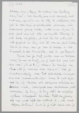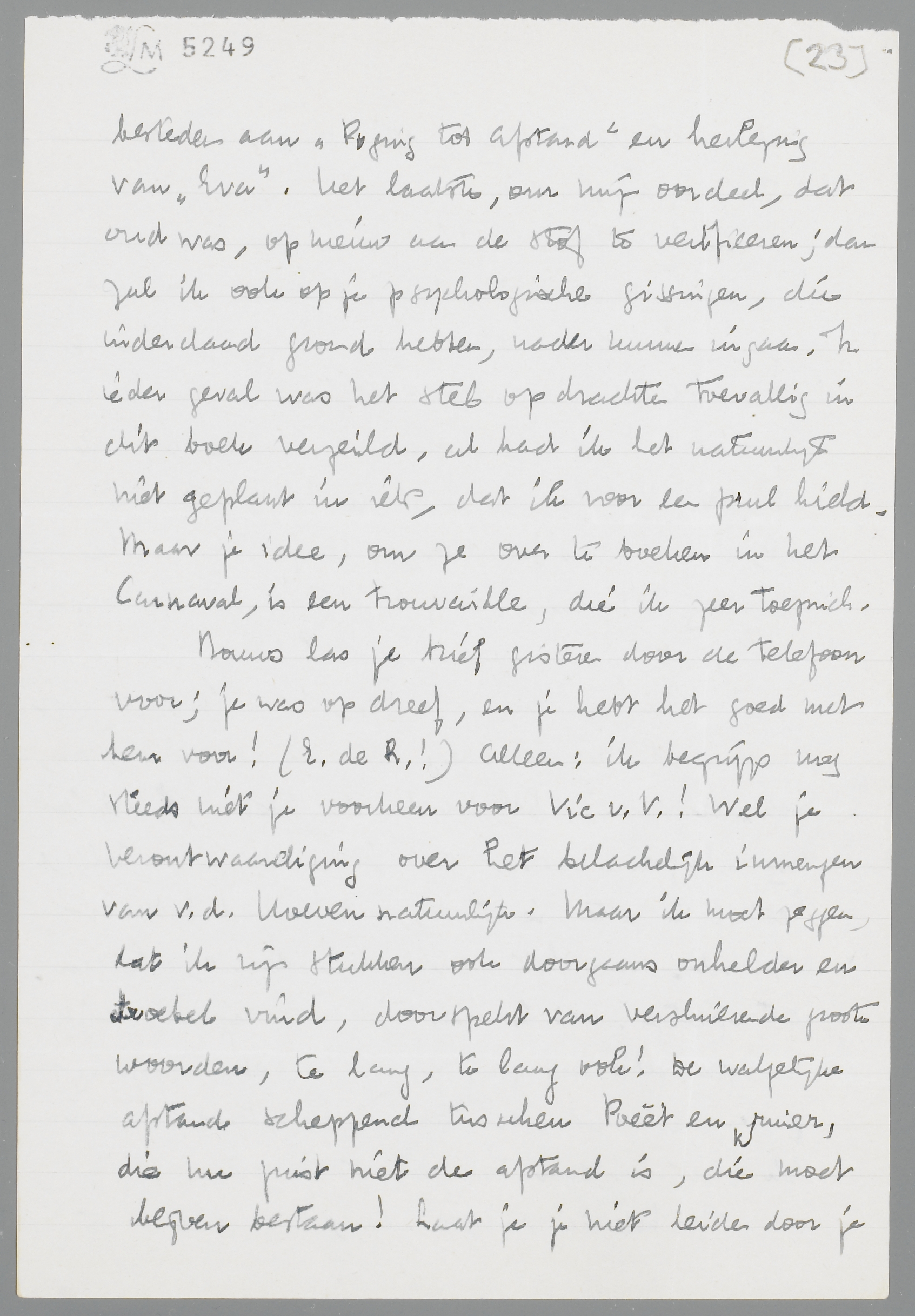 Ik heb me voorgenomen, den Zondag te besteden aan Poging tot afstand en herlezing van Eva. Het laatste, om mijn oordeel, dat oud was, opnieuw aan de stof te verifieeren; dan zal ik ook op je psychologische gissingen, die inderdaad grond hebben, nader kunnen ingaan. In ieder geval was het stel opdrachten toevallig in dit boek verzeild, al had ik het natuurlijk niet geplant in iets, dat ik voor een prul hield. Maar je idee, om ze over te boeken in het Carnaval, is een trouvaille, die ik zeer toejuich. Bouws las je brief gisteren door de telefoon voor; je was op dreef, en je hebt het goed met hem voor! (E. de R.!) Alleen: ik begrijp nog steeds niet je voorkeur voor Vic v.V.! Wel je verontwaardiging over het belachelijk inmengen van v.d. Hoeven natuurlijk. Maar ik moet zeggen, dat ik zijn stukken ook doorgaans onhelder en troebel vind, doorspekt van versluierende groote woorden, te lang, te lang ook! De walgelijke afstand scheppend tusschen Poeët en kruier, die nu juist niet de afstand is, die moet blijven bestaan! Laat je je niet leiden door je persoonlijke voorkeur, die ik ook deel?