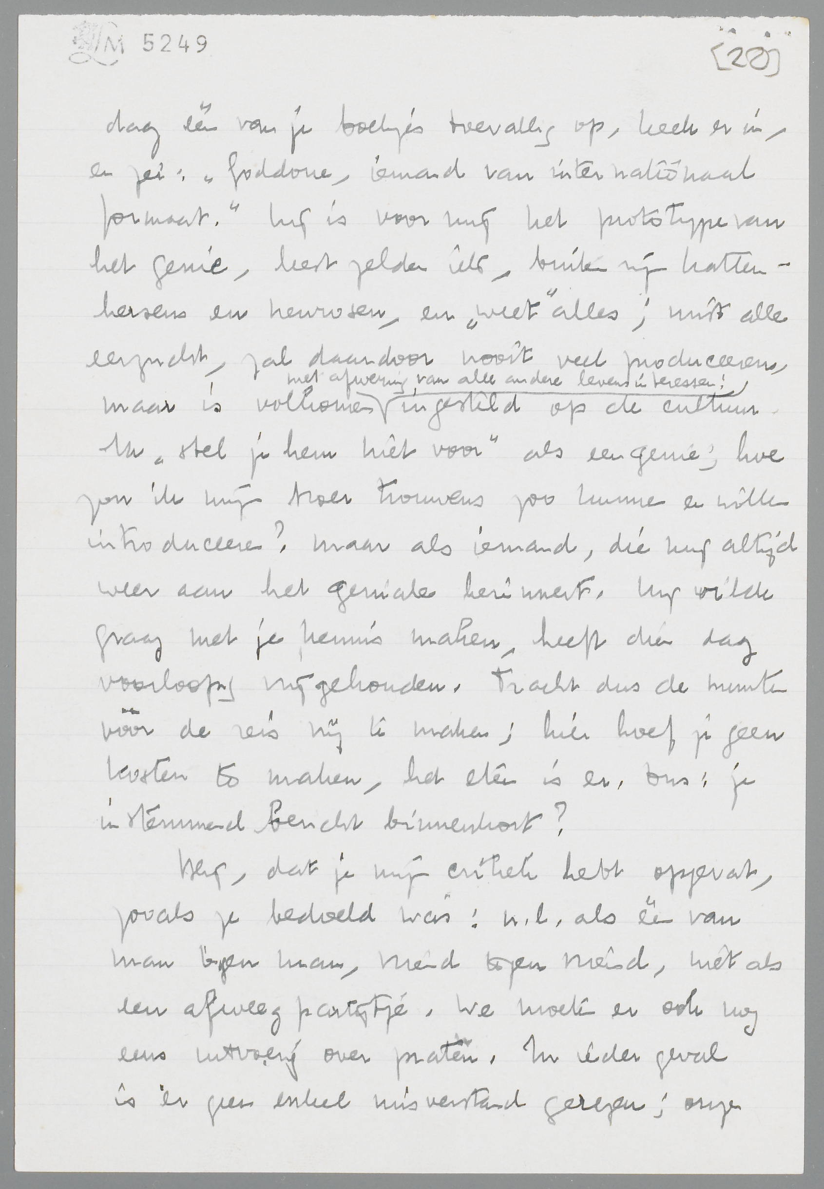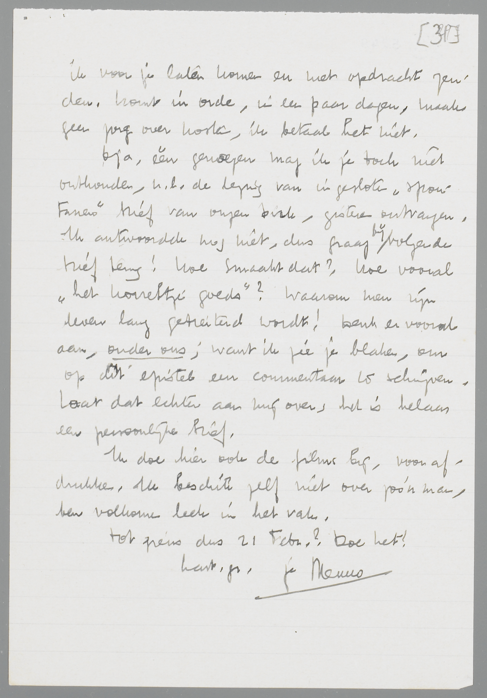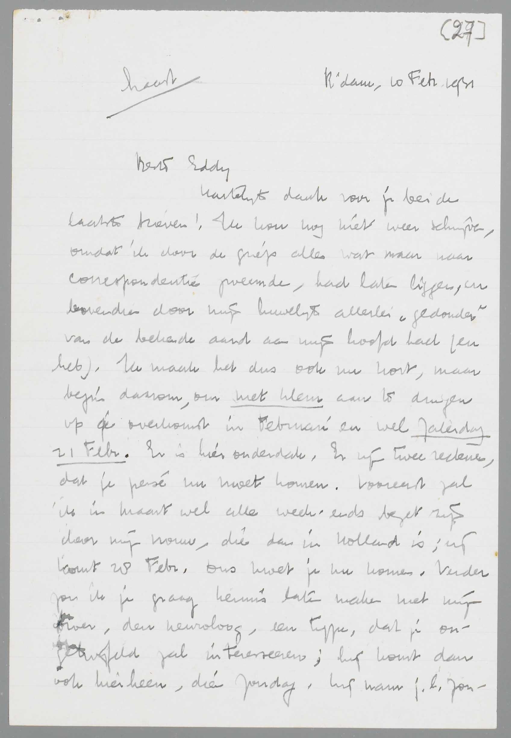 Hartelijk dank voor je beide laatste brieven! Ik kon nog niet weer schrijven, omdat ik door de griep alles wat maar naar correspondentie zweemde, had laten liggen, en bovendien door mijn huwelijk allerlei ‘gedonder’ van de bekende aard aan mijn hoofd had (en heb). Ik maak het dus ook nu kort, maar begin daarom, om met klem aan te dringen op je overkomst in Februari en wel Zaterdag 21 Febr. Er is hier onderdak. Er zijn twee redenen, dat je persé nu moet komen. Vooreerst zal ik in Maart wel alle week-ends bezet zijn door mijn vrouw, die dan in Holland is; zij komt 28 Febr. Dus moet je nu komen. Verder zou ik je graag kennis laten maken met mijn broer, den neuroloog, een type, dat je ongetwijfeld zal interesseeren; hij komt dan ook hierheen, dien Zondag. Hij nam j.l. Zondag één van je boekjes toevallig op, keek er in, en zei: ‘Goddorie, iemand van internationaal formaat’. Hij is voor mij het prototype van het genie, leest zelden iets, buiten zijn kattenhersens en neurosen, en ‘weet’ alles; mist alle eerzucht, zal daardoor nooit veel produceeren, maar is volkomen met afwering van alle andere levensinteressen! ingesteld op de cultuur. Ik ‘stel je hem niet voor’ als een genie; hoe zou ik mijn broer trouwens zoo kunnen en willen introduceeren? Maar als iemand, die mij altijd weer aan het geniale herinnert. Hij wilde graag met je kennis maken, heeft dien dag voorloopig vrijgehouden. Tracht dus de munten voor de reis vrij te maken; hier hoef je geen kosten te maken, het eten is er. Dus: je instemmend bericht binnenkort?