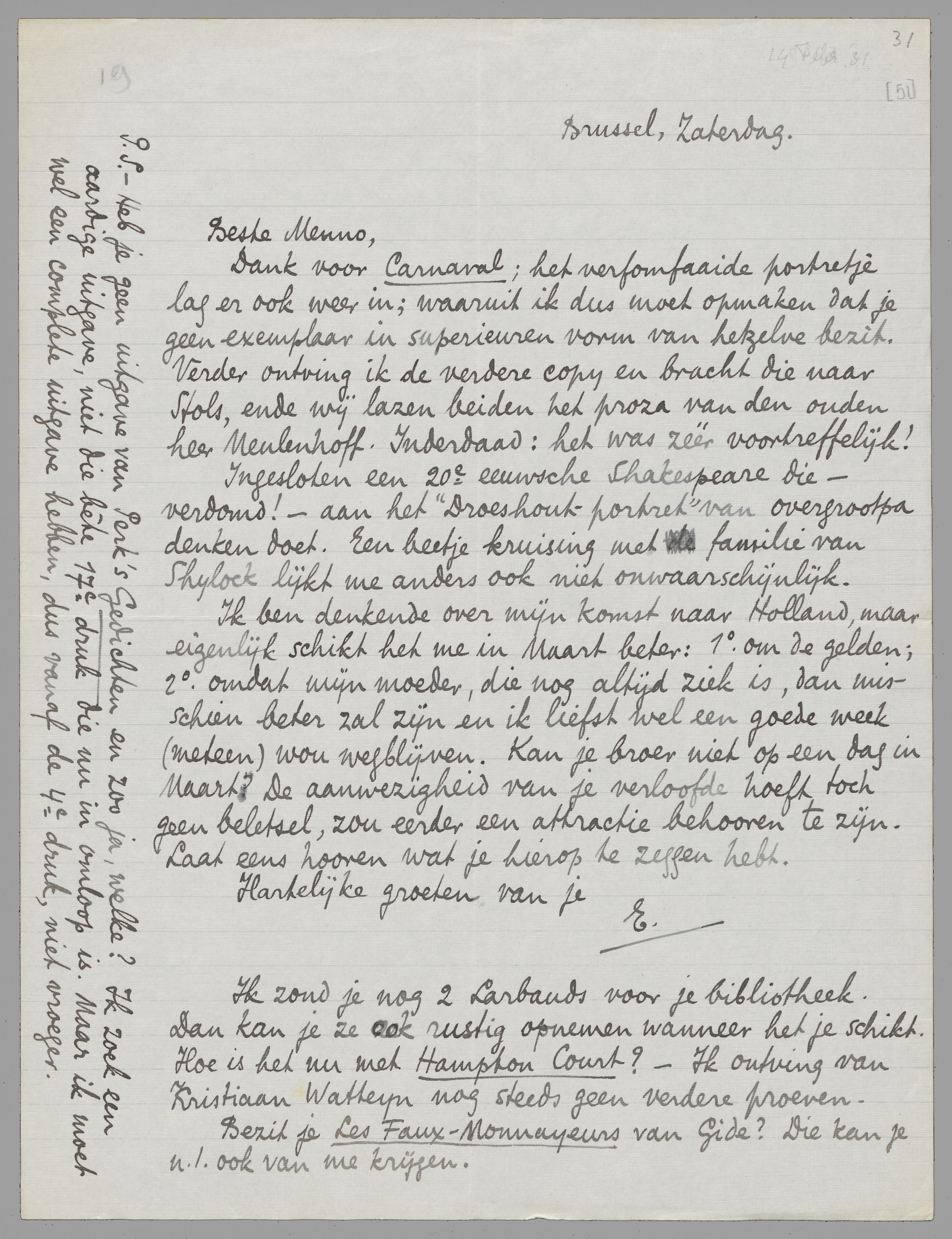 Dank voor Carnaval; het verfomfaaide portretje lag er ook weer in; waaruit ik dus moet opmaken dat je geen exemplaar in superieuren vorm van hetzelve bezit. Verder ontving ik de verdere copy en bracht die naar Stols, ende wij lazen beiden het proza van den ouden heer Meulenhoff. Inderdaad: het was zéér voortreffelijk!