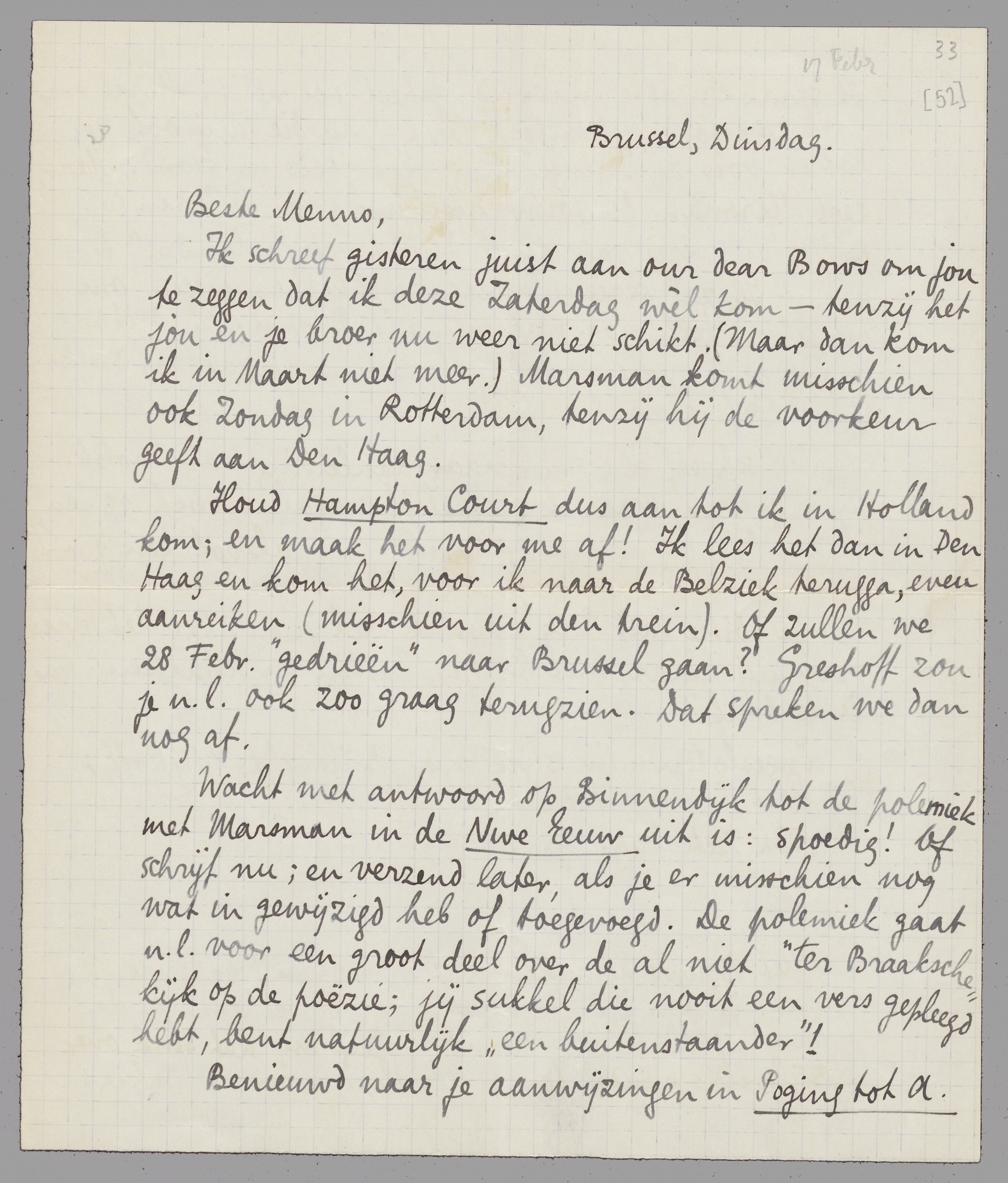 Houd Hampton Court dus aan tot ik in Holland kom; en maak het voor me af! Ik lees het dan in Den Haag en kom het, voor ik naar de Belziek terugga, even aanreiken (misschien uit den trein). Of zullen we 28 Febr. ‘gedrieën’ naar Brussel gaan? Greshoff zou je n.l. ook zoo graag terugzien. Dat spreken we dan nog af.