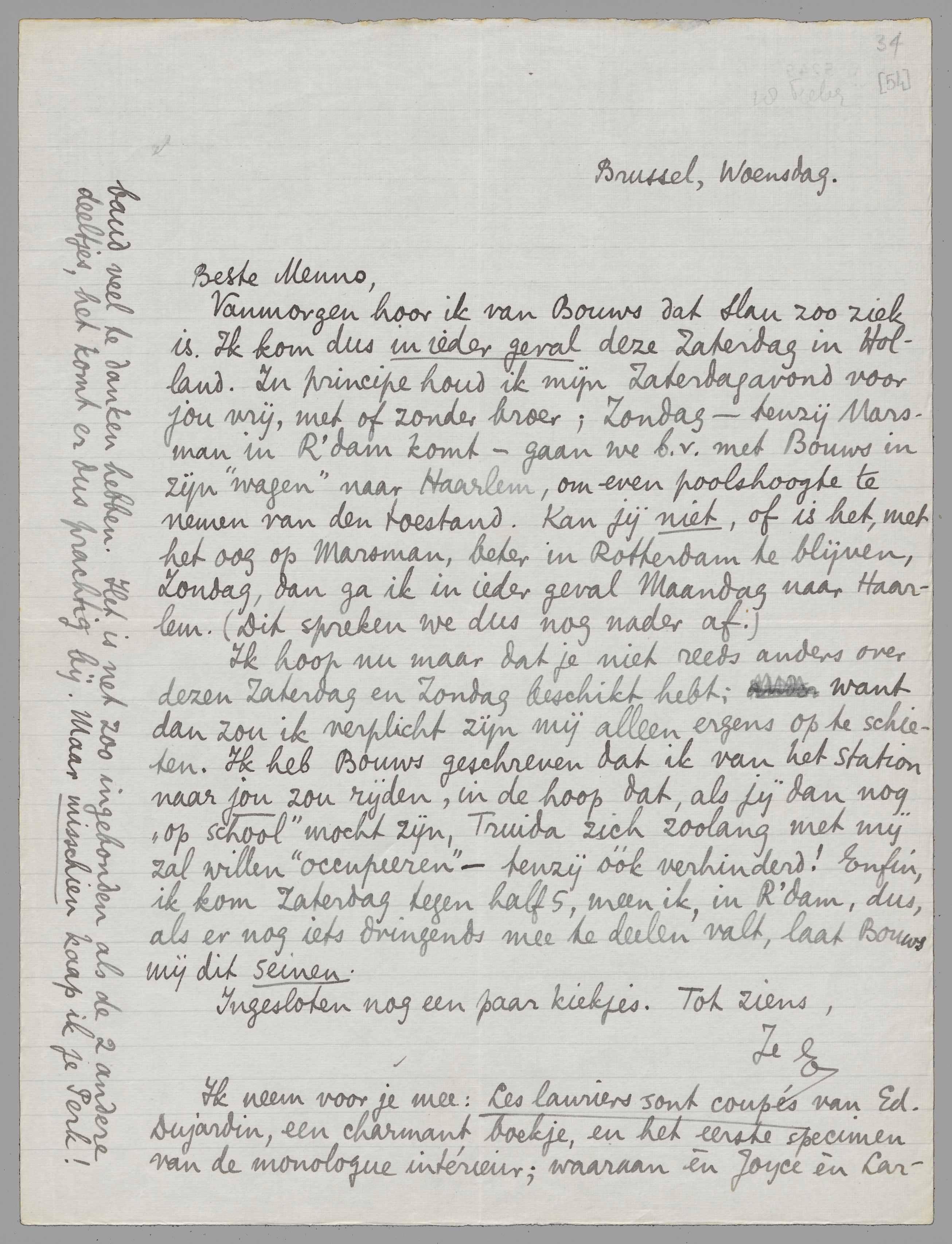 Vanmorgen hoor ik van Bouws dat Slau zoo ziek is. Ik kom dus in ieder geval deze Zaterdag in Holland. In principe houd ik mijn Zaterdagavond voor jou vrij, met of zonder broer; Zondag - tenzij Marsman in R'dam komt - gaan we b.v. met Bouws in zijn ‘wagen’ naar Haarlem, om even poolshoogte te nemen van den toestand. Kan jij niet, of is het, met het oog op Marsman, beter in Rotterdam te blijven, Zondag, dan ga ik in ieder geval Maandag naar Haarlem. (Dit spreken we dus nog nader af.)