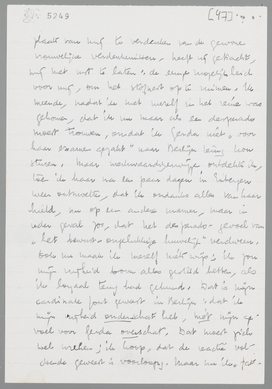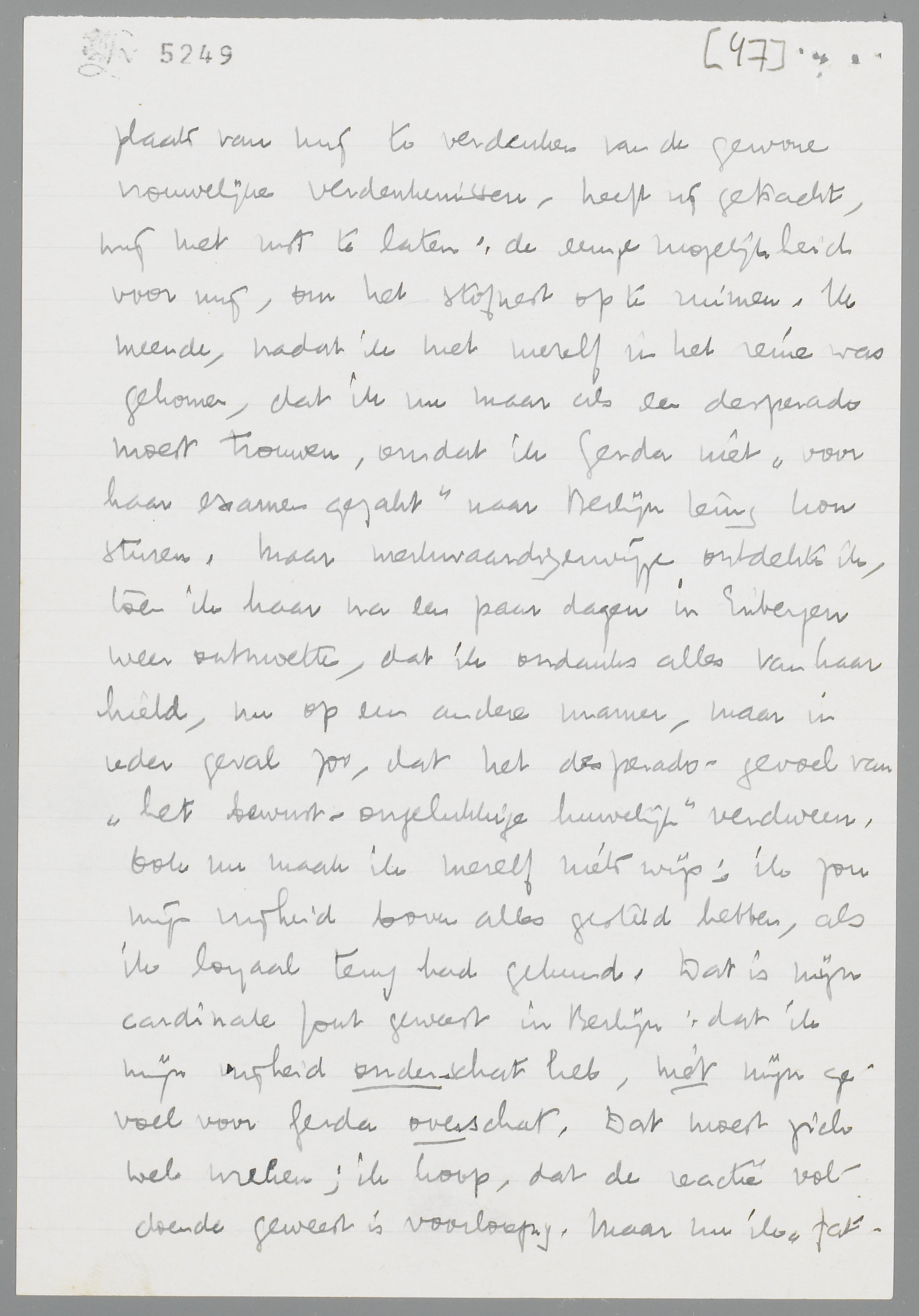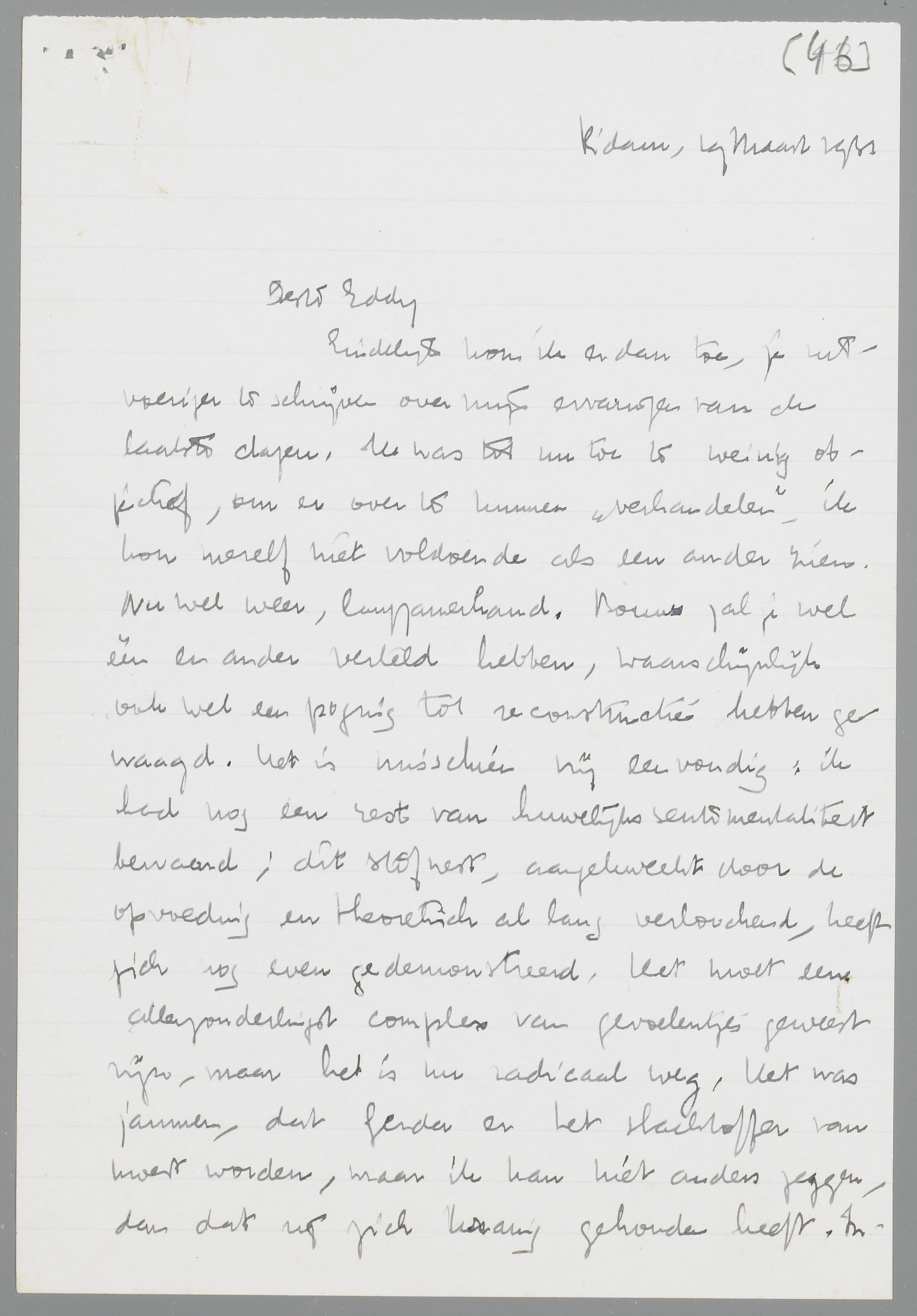 Eindelijk kom ik er dan toe, je uitvoeriger te schrijven over mijn ervaringen van de laatste dagen. Ik was tot nu toe te weinig objectief, om er over te kunnen ‘verhandelen’, ik kon mezelf niet voldoende als een ander zien. Nu wel weer, langzamerhand. Bouws zal je wel één en ander verteld hebben, waarschijnlijk ook wel een poging tot reconstructie hebben gewaagd. Het is misschien vrij eenvoudig: ik had nog een rest van huwelijkssentimentaliteit bewaard; dit stofnest, aangekweekt door de opvoeding en theoretisch al lang verloochend, heeft zich nog even gedemonstreerd. Het moet een allerzonderlingst complex van gevoelentjes geweest zijn, dat Gerda er het slachtoffer van moest worden, maar ik kan niet anders zeggen, dan dat zij zich kranig gehouden heeft. In plaats van mij te verdenken van de gewone vrouwelijke verdenkenissen, heeft zij getracht, mij met rust te laten: de eenige mogelijkheid voor mij, om het stofnest op te ruimen. Ik meende, nadat ik met mezelf in het reine was gekomen, dat ik nu maar als een desperado moest trouwen, omdat ik Gerda niet ‘voor haar examen gezakt’ naar Berlijn terug kon sturen. Maar merkwaardigerwijze ontdekte ik, toen ik haar na een paar dagen in Eibergen weer ontmoette, dat ik ondanks alles van haar hield, nu op een andere manier, maar in ieder geval zoo, dat het desperado-gevoel van ‘het bewust-ongelukkige huwelijk’ verdween. Ook nu maak ik mezelf niets wijs; ik zou mijn vrijheid boven alles gesteld hebben, als ik loyaal terug had gekund. Dat is mijn cardinale fout geweest in Berlijn: dat ik mijn vrijheid onderschat heb, niet mijn gevoel voor Gerda overschat. Dat moest zich wel wreken: ik hoop, dat de reactie voldoende geweest is voorloopig. Maar nu ik ‘fatsoenshalve’ niet meer terugkan, nu geloof ik, dat ik in Gerda geen verkeerde vrouw heb. Zij heeft zich tenminste buitengewoon aangepast en ingezien, dat het van mij geen kinderspel was. Zij zal mij mijn vrijheid laten, voorzoover dat mogelijk is. Überhaupt herinnerde me de scène in je roman tusschen Boudewijn en zijn vrouw, die met haar pakjes valt, eenigszins aan de her-ontmoeting tussen Gerda en mij. Ik, vastbesloten, om nu de zaak ‘zakelijk’ te behandelen, maar ontdekkend, dat er toch allerlei relaties tusschen ons bestaan, die onloochenbaar zijn. Voor het oogenblik is dat mij voldoende: het is meer, dan ik verleden week mocht verwachten.