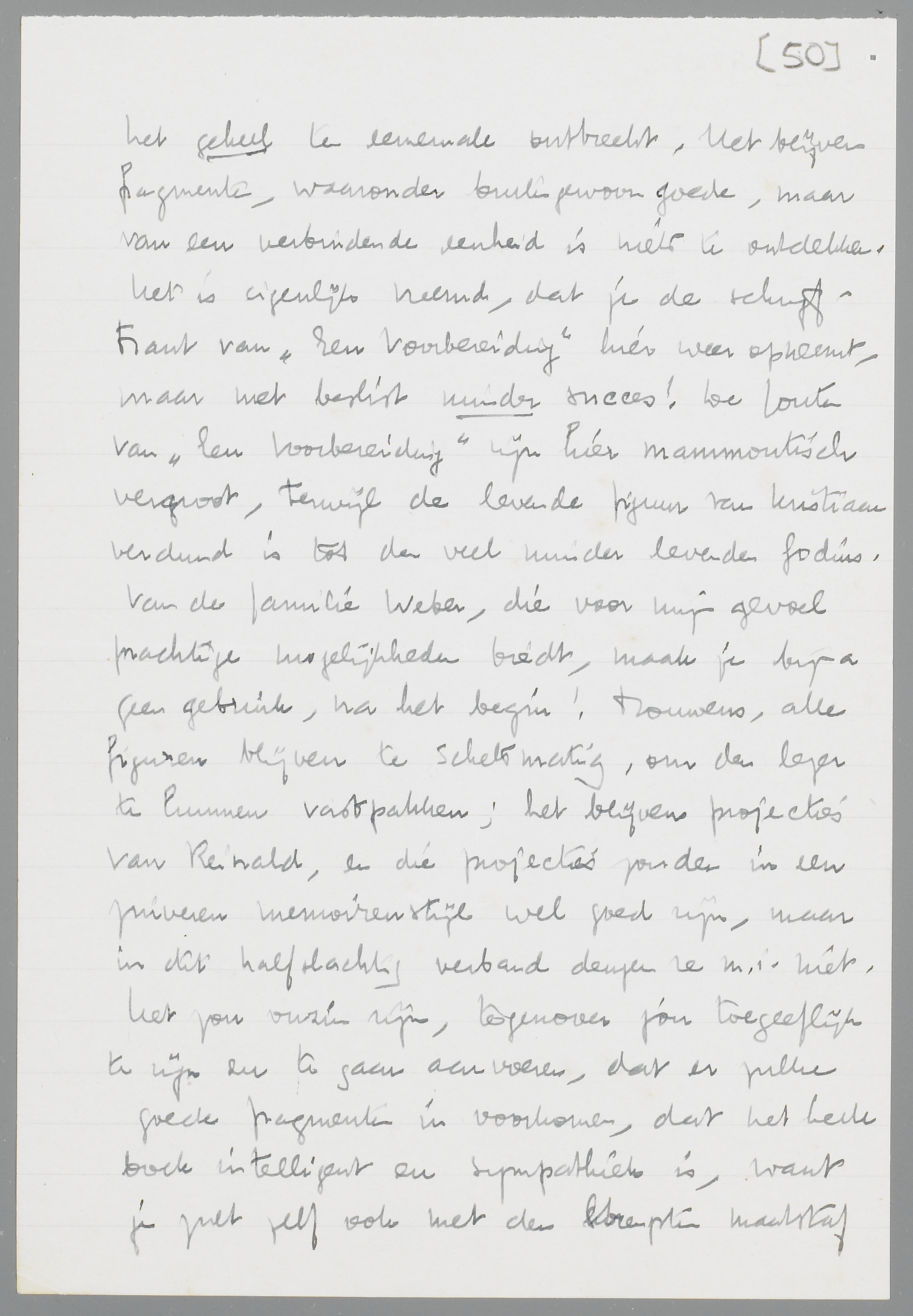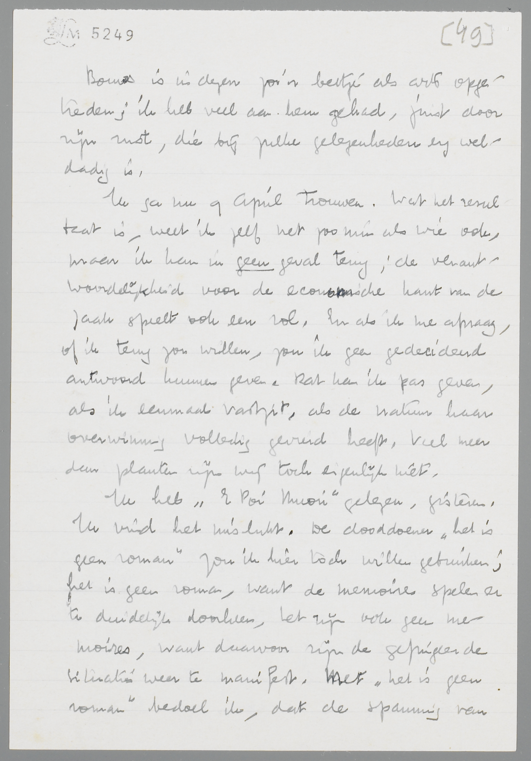 Ik heb E Poi Muori gelezen, gisteren. Ik vind het mislukt. De dooddoener ‘het is geen roman’ zou ik hier toch willen gebruiken; het is geen roman, want de memoires spelen er te duidelijk doorheen, het zijn ook geen memoires, want daarvoor zijn de gefingeerde situaties weer te manifest. Met ‘het is geen roman’ bedoel ik, dat de spanning van het geheel ten eenenmale ontbreekt. Het blijven fragmenten, waaronder buitengewoon goede, maar van een verbindende eenheid is niets te ontdekken. Het is eigenlijk vreemd, dat je de schrijftrant van Een Voorbereiding hier weer opneemt, maar met beslist minder succes! De fouten van Een Voorbereiding zijn hier mammoutisch vergroot, terwijl de levende figuur van Kristiaan verdund is tot den veel minder levenden Godius. Van de familie Weber, die voor mijn gevoel prachtige mogelijkheden biedt, maak je bijna geen gebruik, na het begin! Trouwens, alle figuren blijven te schetsmatig, om den lezer te kunnen vastpakken; het blijven projecties van Reinald, en die projecties zouden in een zuiveren memoirenstijl wel goed zijn, maar in dit halfslachtig verband deugen ze m.i. niet. Het zou onzin zijn, tegenover jou toegeeflijk te zijn en te gaan aanvoeren, dat er zulke goede fragmenten in voorkomen, dat het heele boek intelligent en sympathiek is, want je zult zelf ook met den strengsten maatstaf gemeten willen worden, die van het geheel. Ik mis altijd nog de vaart, die geen enkele bedenking doet opkomen, van je critieken, van de Cahiers, en van het Gebed. Dit is niet je maximale potentie, het is tenslotte een verlitteratuurde du Perron, die de gave mist, buiten zichzelf te treden, en toch een roman schrijft. Dit is m.i. de fout; je was in de stemming voor memoires en trachtte een roman te maken. Daardoor wordt de illusie van een intrige, van een verloop, van een ontwikkeling, telkens doodelijk onderbroken door de dialogen, wordt het geheel zeer onbevredigend.