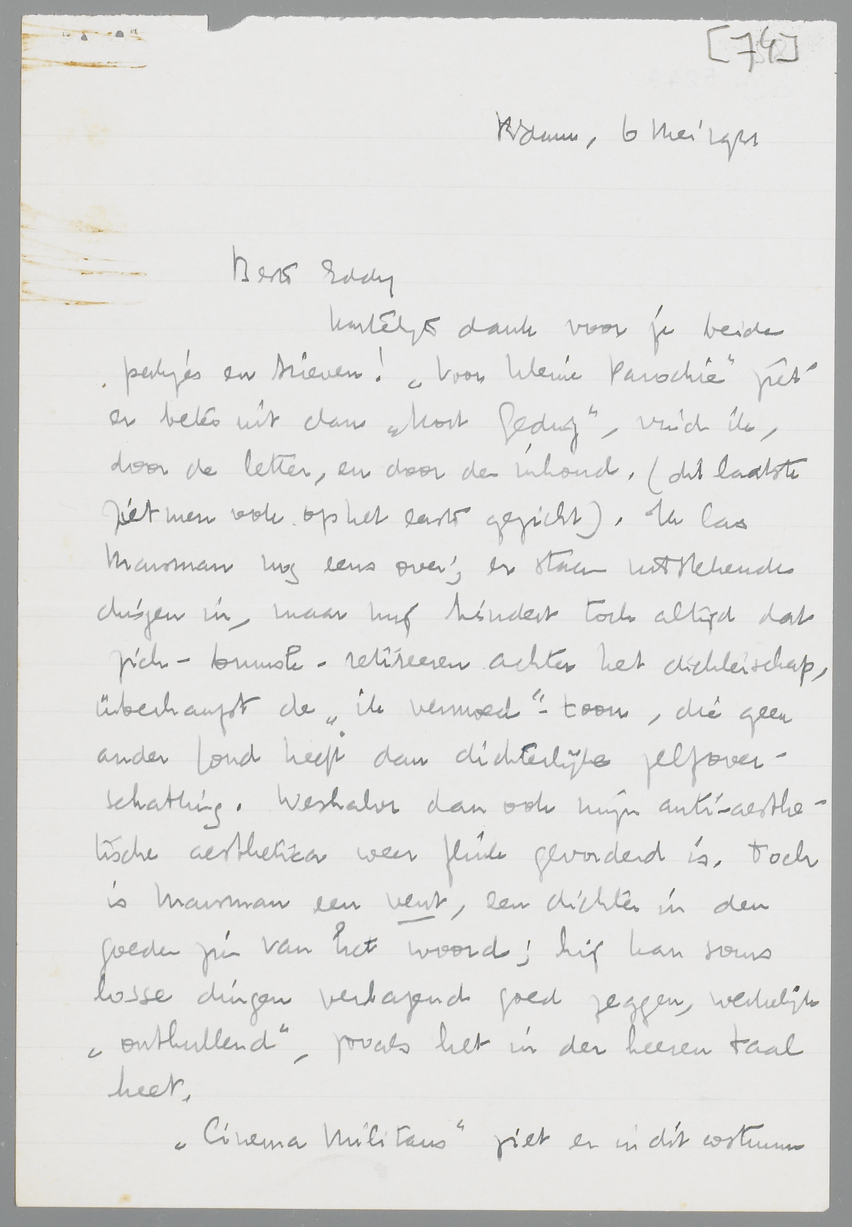 Vanmiddag zond ik je De Stem van Mei, waarin veel wetenswaardigs staat, dat je zal boeien. Primo Coster's uitdaging aan jouw adres, dat je aanleiding moet geven, een grondig essay over zijn grondeloosheid te schrijven. Maar dan nu ook werkelijk afdoende, fundamenteel! Ik zou het zelfs zoo snijdend en zakelijk mogelijk doen, op de kern van de zaak af. Hij geeft zich overigens nogal erg bloot, met die verbeten armeluis-mop over het ‘kasteel’ (had ik het zelf maar, stinkt er uit). Het is toch een mieserig mannetje, en zoo uiterst kwetsbaar bovendien. - Verder staan er weer nieuwe documenten voor Anthonie's aderverkalking in dit nummer, zelfs een zeer duidelijke sneer aan mijn adres (radio!). Enfin, hij krijgt zijn pil in de Vrije Bladen te slikken, zij het dan ook zonder diarrhee.