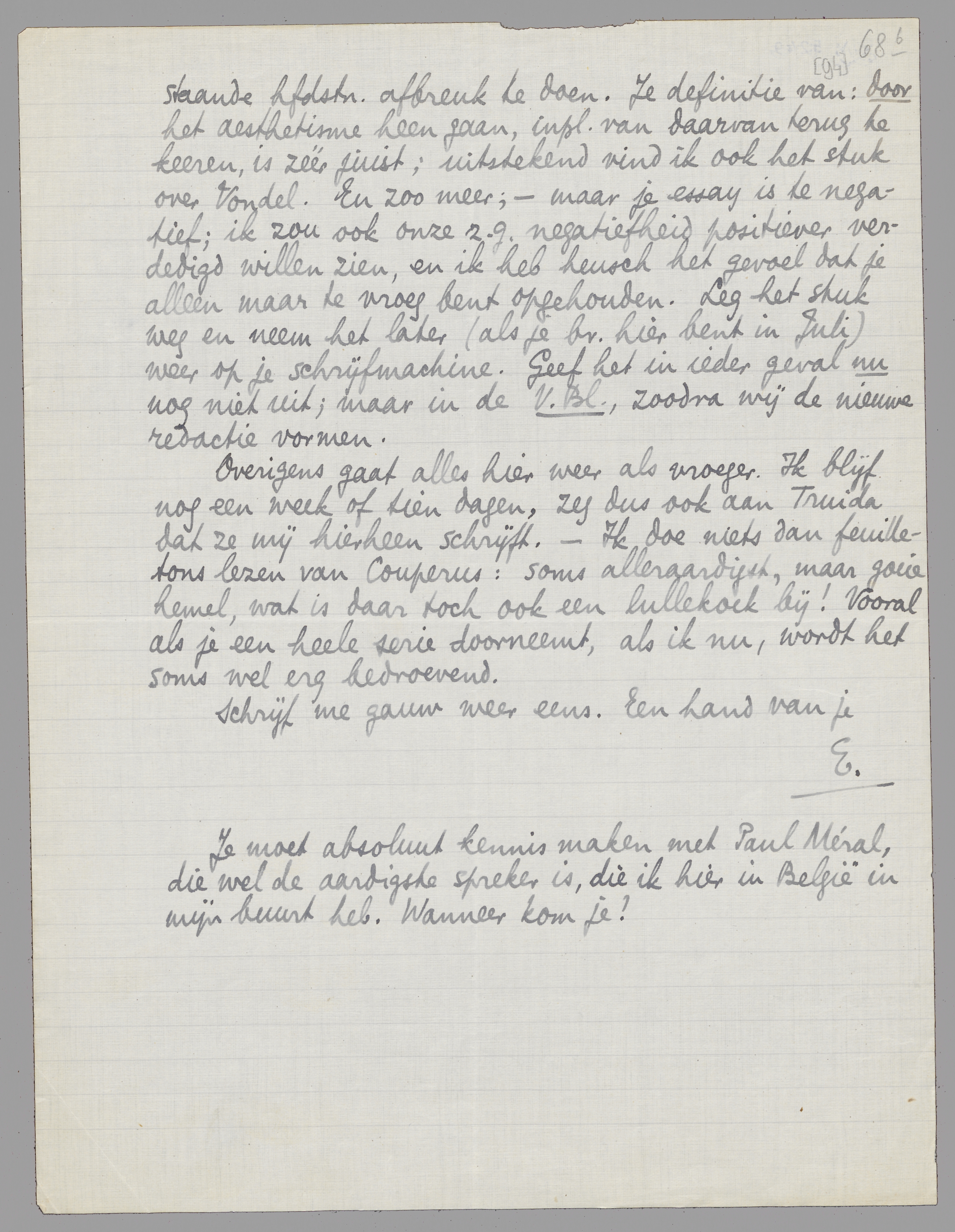 Later, mondeling meer. Misschien schrijf je je stuk nog geheel anders, d.w.z. breid je het aanmerkelijk uit, als we er in details over hebben gesproken (niet zoozeer over het stuk, als over het gegeven). Maar kom daarvoor hier, dat is veel beter. Zooiets moet, vind ik, door gesprekken ernaast, levend gehouden worden; een bepaalde volgorde is niet absoluut noodig, men kan nog van alles zeggen, zonder aan de reeds bestaande hfdstn. afbreuk te doen. Je definitie van: door het aesthetisme heen gaan, inpl. van daarvan terug te keeren, is zéér juist; uitstekend vind ik ook het stuk over Vondel. En zoo meer; - maar je essay is te negatief; ik zou ook onze z.g. negatiefheid positiever verdedigd willen zien, en ik heb heusch het gevoel dat je alleen maar te vroeg bent opgehouden. Leg het stuk weg en neem het later (als je bv. hier bent in Juli) weer op je schrijfmachine. Geef het in ieder geval nu nog niet uit; maar in de V.Bl., zoodra wij de nieuwe redactie vormen.