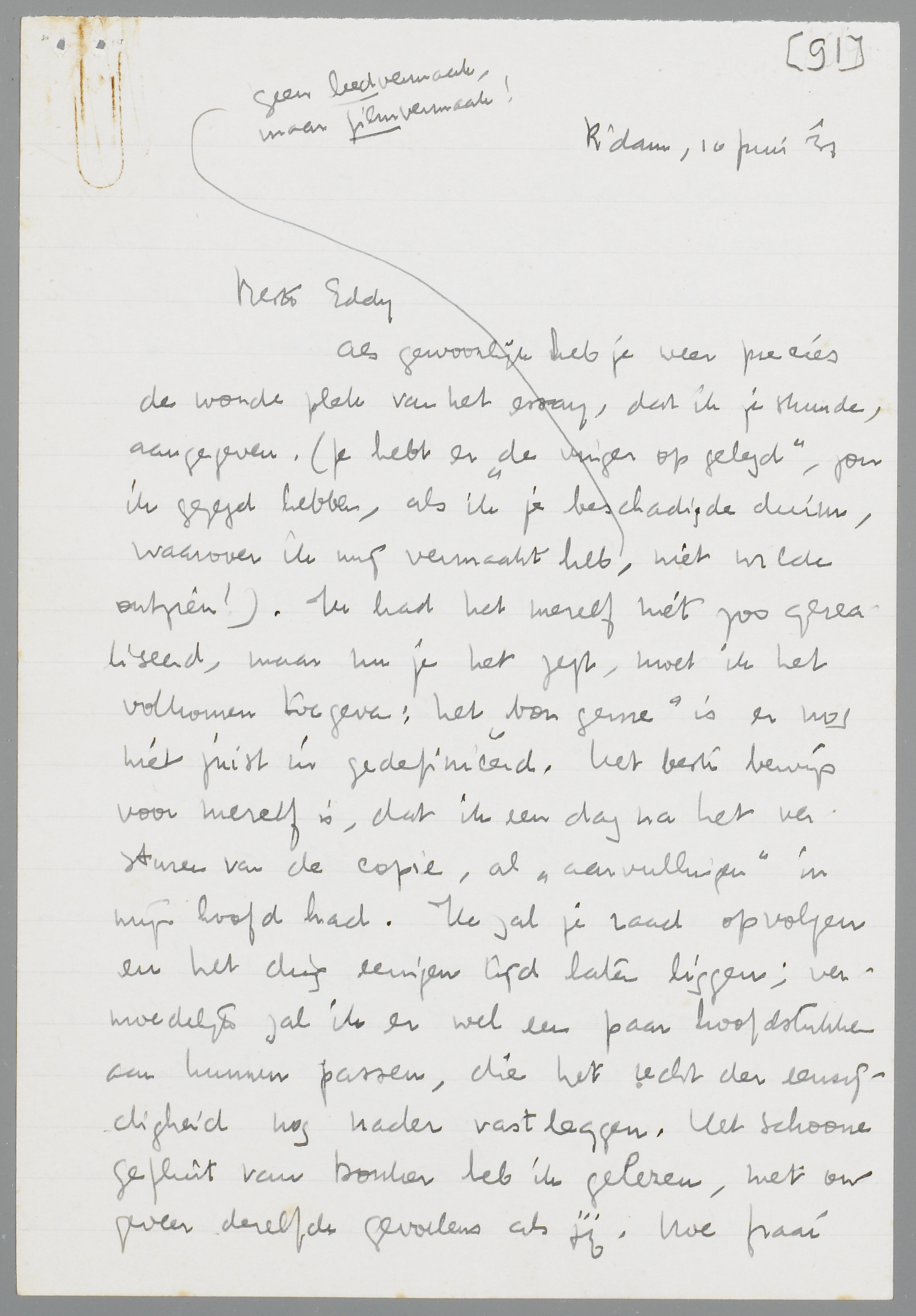 Als je nog meer adviezen vindt voor de positieve verdediging van de eenzijdigheid, houd ik me aanbevolen! Eén van de punten, die ik nog niet aanroerde, is b.v. het onmuzikale van onze houding (of liever: anti-muzikale, de muziek laat eigenlijk geen keuze toe, is niet in staat ‘bon genre’ te worden); verder: de verhouding van de gedemaskeerde schoonheid tot de wijsheid (philosophisch bedoeld). Ja werkelijk, ik ben te vroeg opgehouden! Maar er zal nog wel wat komen!