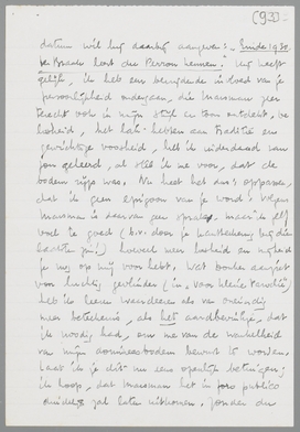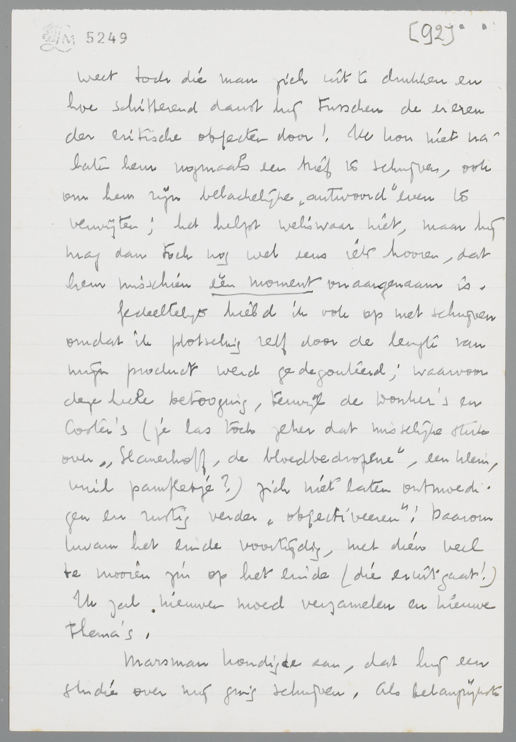 Als gewoonlijk heb je weer precies de wonde plek van het essay, dat ik je stuurde, aangegeven. (Je hebt er ‘de vinger op gelegd’, zou ik gezegd hebben, als ik je beschadigde duim, waarover ik mij vermaakt heb, geen leedvermaak maar filmvermaak! niet wilde ontzien!) Ik had het mezelf niet zoo gerealiseerd, maar nu je het zegt, moet ik het volkomen toegeven: het ‘bon genre’ is er nog niet juist in gedefinieerd. Het beste bewijs voor mezelf is, dat ik een dag na het versturen van de copie, al ‘aanvullingen’ in mijn hoofd had. Ik zal je raad opvolgen en het ding eenigen tijd laten liggen; vermoedelijk zal ik er wel een paar hoofdstukken aan kunnen passen, die het recht der eenzijdigheid nog nader vastleggen. Het schoone gefluit van Donker heb ik gelezen, met ongeveer dezelfde gevoelens als jij. Hoe fraai weet toch die man zich uit te drukken en hoe schitterend danst hij tusschen de eieren der critische objecten door! Ik kon niet nalaten hem nogmaals een brief te schrijven, ook om hem zijn belachelijke ‘antwoord’ even te verwijten; het helpt weliswaar niet, maar hij mag dan toch nog wel eens iets hooren, dat hem misschien één moment onaangenaam is.