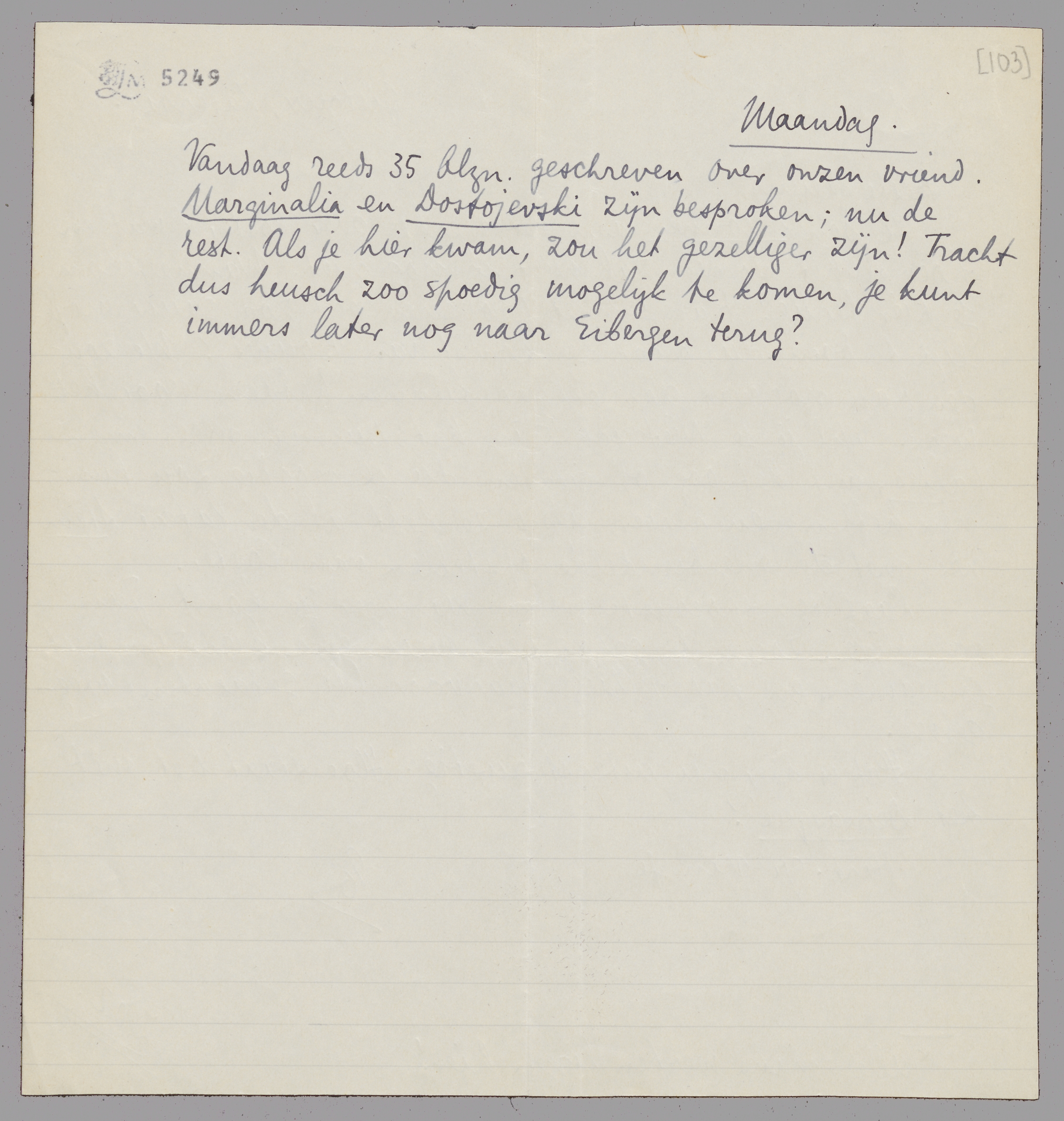 Vandaag reeds 35 blzn. geschreven over onzen vriend. Marginalia en Dostojevski zijn besproken; nu de rest. Als je hier kwam, zou het gezelliger zijn! Tracht dus heusch zoo spoedig mogelijk te komen, je kunt immers later nog naar Eibergen terug?