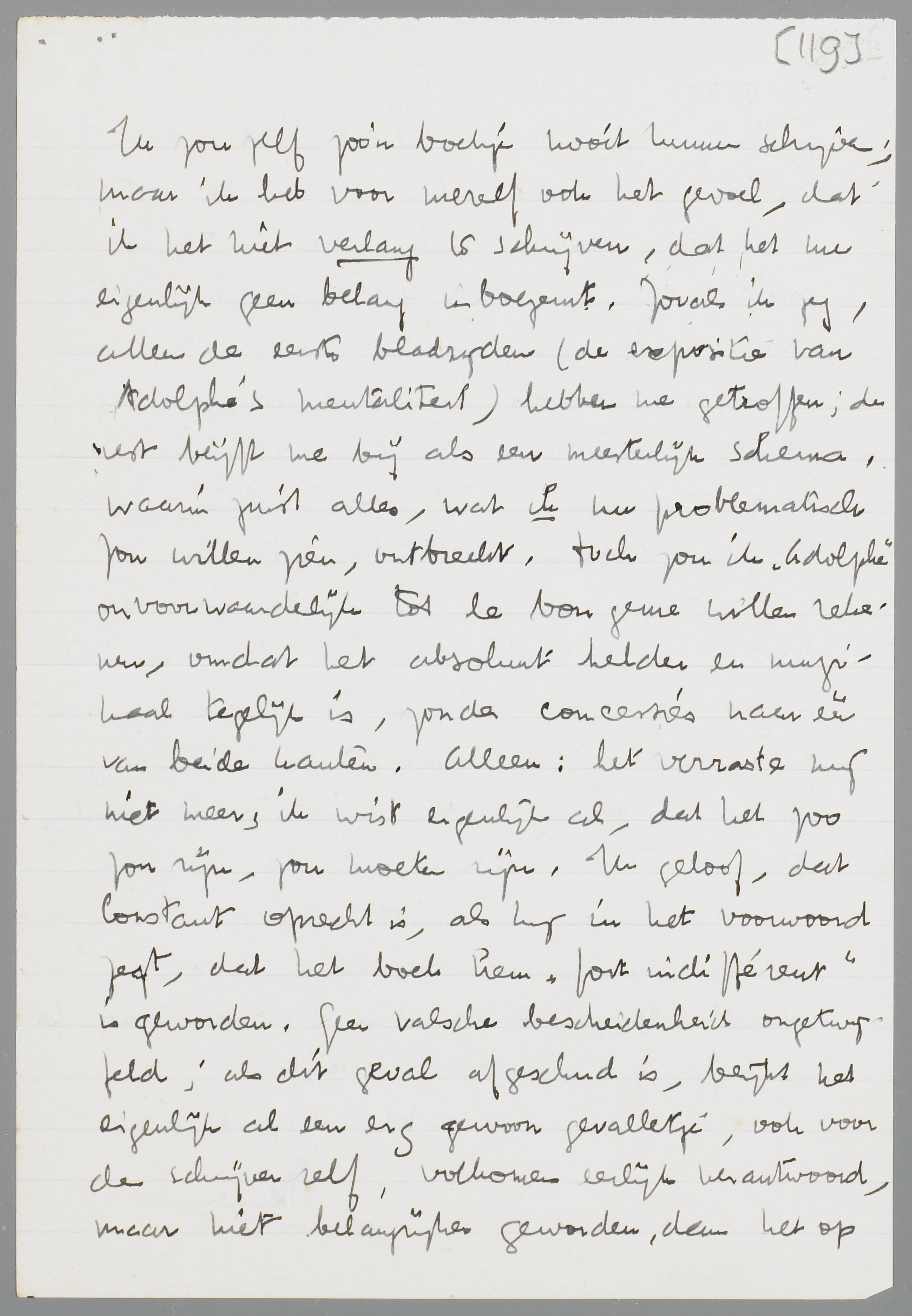 Ik heb Point Counter Point uitgelezen, benevens Adolphe. Voor Huxley koester ik après tout toch een enorme bewondering; hij ging me in het tweede deel steeds meer boeien. Er mag van alles op hem aan te merken zijn: een uitstekend psycholoog is hij zeker en zijn ‘systeem’ is op den duur toch ook niet vervelend. Het is te uitgebreid, maar er zit toch qualiteit genoeg in. Overigens lijkt het me duidelijk, dat Huxley zich met Philip Quarles vereenzelvigt, die, hoe objectief hij ook ‘tegenpunt’ wordt, toch de sympathieke figuur blijft. (In zijn novellen kan ik die voorkeur niet ontdekken). Misschien trekt mij het engelsche fond van het boek ook aan, omdat het mij verwant is als bodem van zulke kunstenaars en intellectueelen. In ieder geval, merkwaardig genoeg kon ik daarna Adolphe nauwelijks genieten. Ik moet erkennen, dat het in zijn soort een meesterwerkje is, vrij van iedere duisterheid en opstopping; voor twee, drie jaar zou het me ook veel gedaan hebben. Nu blijf ik er volkomen koud bij en, afgezien van de eerste bladzijden, ongeïnteresseerd. Hebben wij deze affaire misschien zoo duidelijk voor oogen, dat de zakelijke behandeling van Constant ons niet meer raakt? Ik weet het niet; maar allerlei schakeeringen, die ik bij Huxley proef, en toejuich, gaan bij Constant schuil achter zijn al te geserreerde psychologie. Ik zou zelf zoo'n boekje nooit kunnen schrijven; maar ik heb voor mezelf ook het gevoel, dat ik het niet verlang te schrijven, dat het me eigenlijk geen belang inboezemt. Zooals ik zeg, alleen de eerste bladzijden (de expositie van Adolphe's mentaliteit) hebben me getroffen; de rest blijft me bij als een meesterlijk schema, waarin juist alles, wat ik nu problematisch zou willen zien, ontbreekt. Toch zou ik Adolphe onvoorwaardelijk tot le bon genre willen rekenen, omdat het absoluut helder en muzikaal tegelijk is, zonder concessies naar één van beide kanten. Alleen: het verraste mij niet meer; ik wist eigenlijk al, dat het zoo zou zijn, zou moeten zijn. Ik geloof, dat Constant oprecht is, als hij in het voorwoord zegt, dat het boek hem ‘fort indifférent’ is geworden. Geen valsche bescheidenheid ongetwijfeld; als dit geval afgeschud is, blijkt het eigenlijk al een erg gewoon gevalletje, ook voor den schrijver zelf, volkomen eerlijk verantwoord, maar niet belangrijker geworden, dan het op zichzelf was, toen het geleefd werd. Voor hypocrieten op liefdesgebied is Adolphe natuurlijk een model, dat zij zich kunnen aantrekken; voor anderen, die geen speciale hypocrisie bezitten op dit punt, heeft het zijn verrassing grootendeels verloren, lijkt me. Ik voelde de tijd, de afstand van de jaren, toen ik Adolphe las; een bedenkelijk teeken, niet voor Constant, maar voor de verhouding Constant - ter Braak.