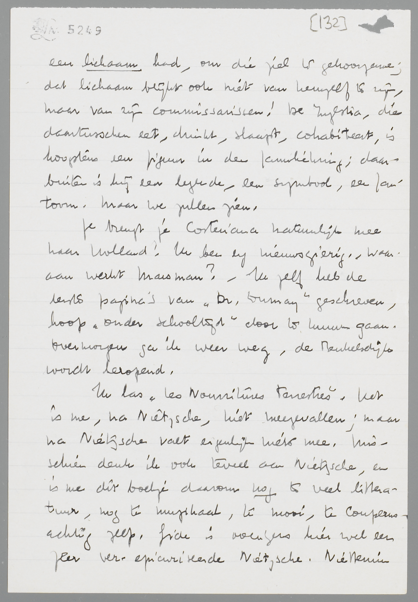 Ik las les Nourritures Terrestres. Het is me, na Nietzsche, niet meegevallen; maar na Nietzsche valt eigenlijk niets mee. Misschien denk ik ook teveel aan Nietzsche, en is me dit boekje daarom nog te veel litteratuur, nog te muzikaal, te mooi, te Couperusachtig zelfs. Gide is overigens hier wel een zeer ver-epicuriseerde Nietzsche. Niettemin heb ik verschillende bladzijden met bewondering gelezen. Ik voor mij zou het hervinden van de aardsche verrukkingen nuchterder te boek willen stellen, minder in een van paederastische damp verzadigde atmosfeer. Maar die Nietzsche ook; die vergalt me de rest van het lezenswaardige.