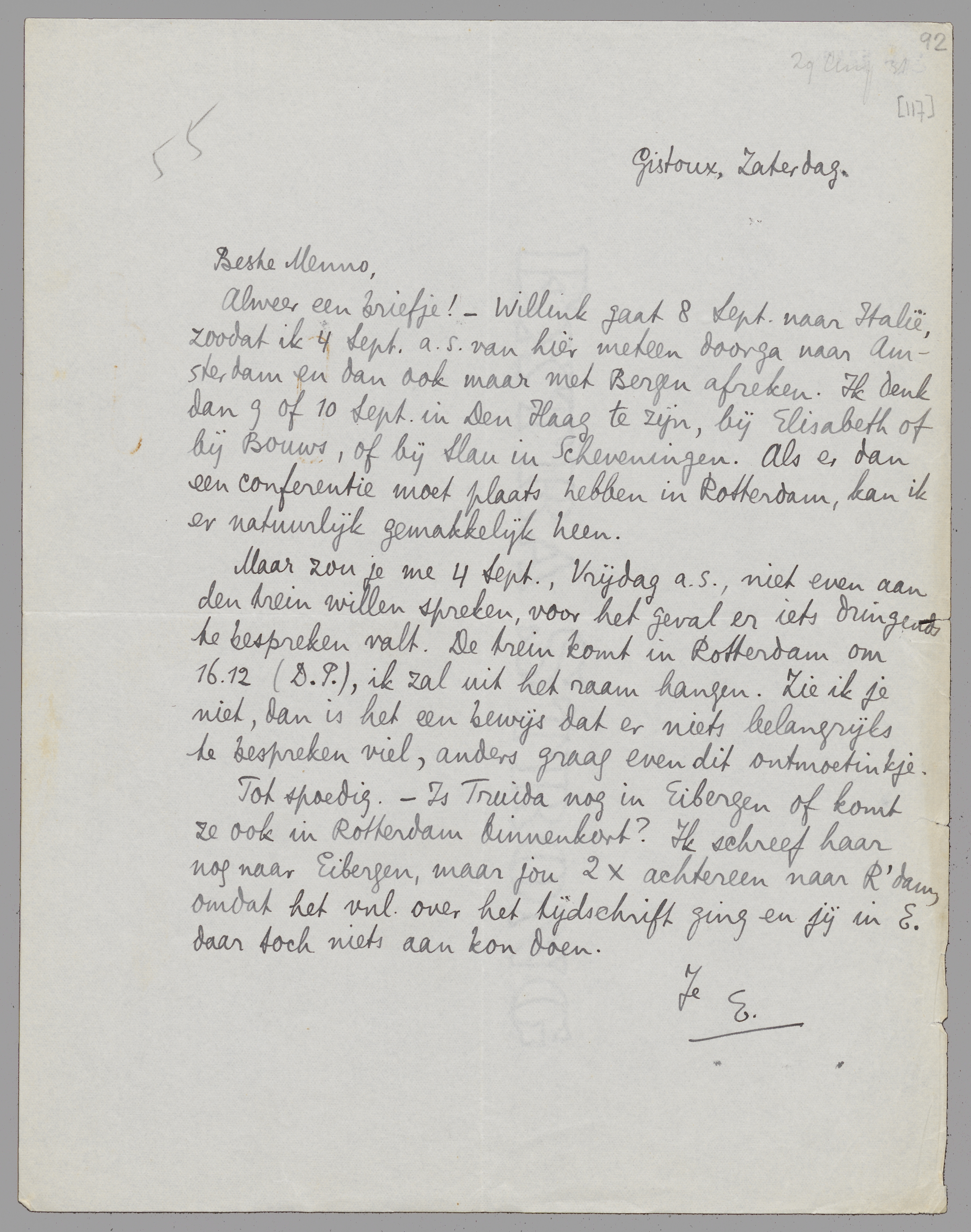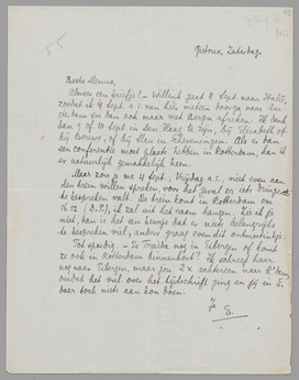 Maar zou je me 4 Sept., Vrijdag a.s., niet even aan den trein willen spreken, voor het geval er iets dringends te bespreken valt. De trein komt in Rotterdam om 16.12 (D.P.), ik zal uit het raam hangen. Zie ik je niet, dan is het een bewijs dat er niets belangrijks te bespreken viel, anders graag even dit ontmoetinkje.