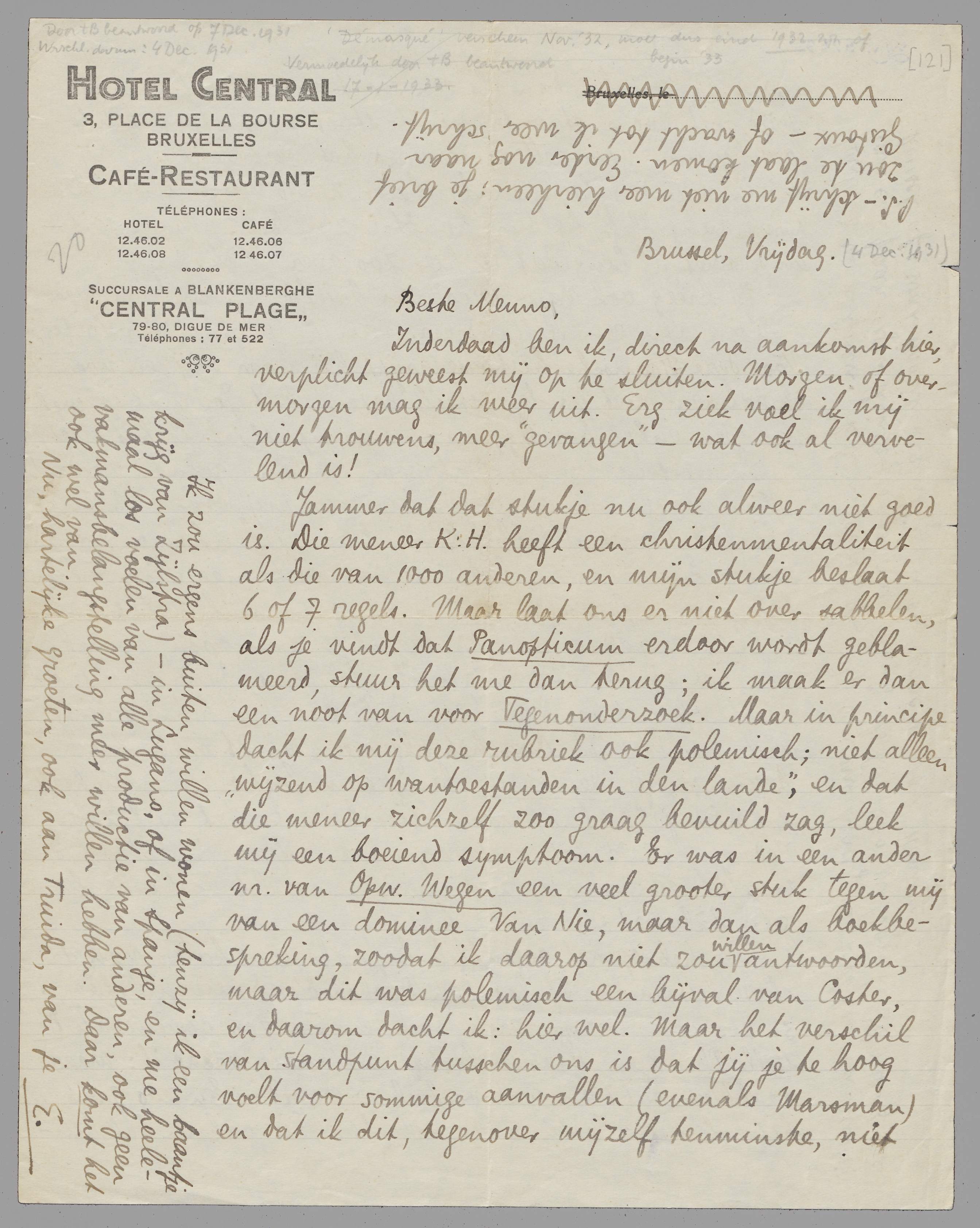 Jammer dat dat stukje nu ook alweer niet goed is. Die meneer K.H. heeft een christenmentaliteit als die van 1000 anderen, en mijn stukje beslaat 6 of 7 regels. Maar laat ons er niet over sabbelen, als je vindt dat Panopticum erdoor wordt geblameerd, stuur het me dan terug; ik maak er dan een noot van voor Tegenonderzoek. Maar in principe dacht ik mij deze rubriek ook polemisch; niet alleen ‘wijzend op wantoestanden in den lande’, en dat die meneer zichzelf zoo graag bevuild zag, leek mij een boeiend symptoom. Er was in een ander nr. van Opw. Wegen een veel grooter stuk tegen mij van een dominee Van Nie, maar dan als boekbespreking, zoodat ik daarop niet zou willen antwoorden, maar dit was polemisch een bijval van Coster, en daarom dacht ik: hier wel. Maar het verschil van standpunt tusschen ons is dat jij te hoog voelt voor sommige aanvallen (evenals Marsman) en dat ik dit, tegenover mijzelf tenminste, niet anders kan voelen dan als een soort excuus. Ik zou den strijd met zoo'n stronthommel stoot voor stoot eindeloos kunnen voortzetten; ik vind het vervelend als hij en zijn vrindjes kunnen denken: ‘zie je wel, nu we hem terug aangeblaft hebben, houdt-i z'n bek’. Maar soit - en je weet al lang dat ik hier zoo over denk.
