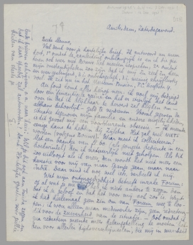 Veel dank voor je hartelijke brief. Ik antwoord nu maar kort, 1o omdat de ‘aanleiding’ onbelangrijk is en ik die gisteren ook weer met Bouws heb moeten bespreken; 2o omdat mijn omstandigheden zoo zijn dat ik mij èn ziek èn heen en weer geslingerd, d.i. onbehagelijk, d.i. weinig schrijflustig voel. Ik zit nu in het Museum-Pension, P.C. Hooftstr. 4.