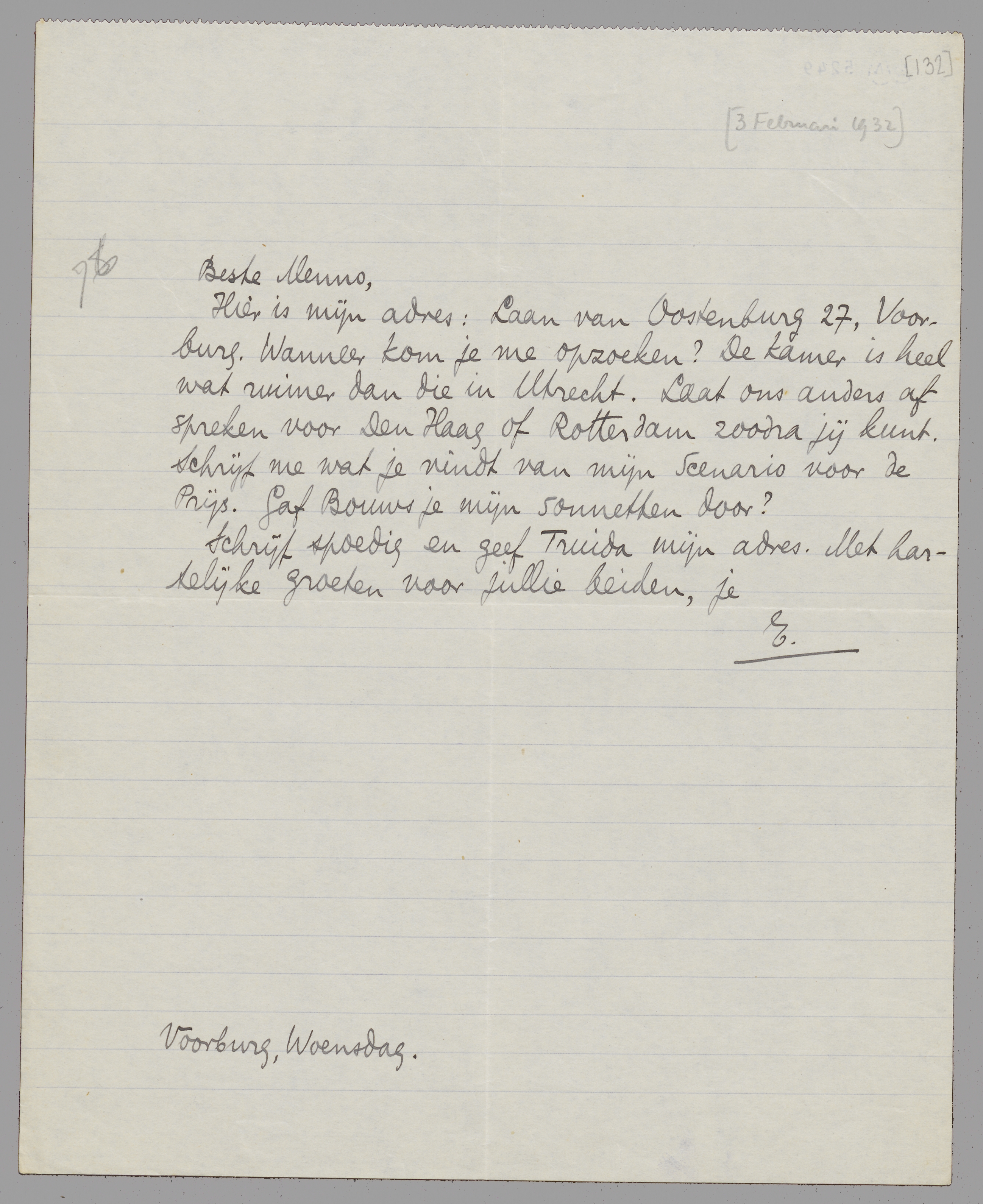 Hier is mijn adres: Laan van Oostenburg 27, Voorburg. Wanneer kom je me opzoeken? De kamer is heel wat ruimer dan die in Utrecht. Laat ons anders afspreken voor Den Haag of Rotterdam zoodra jij kunt. Schrijf me wat je vindt van mijn Scenario voor de Prijs. Gaf Bouws je mijn sonnetten door?