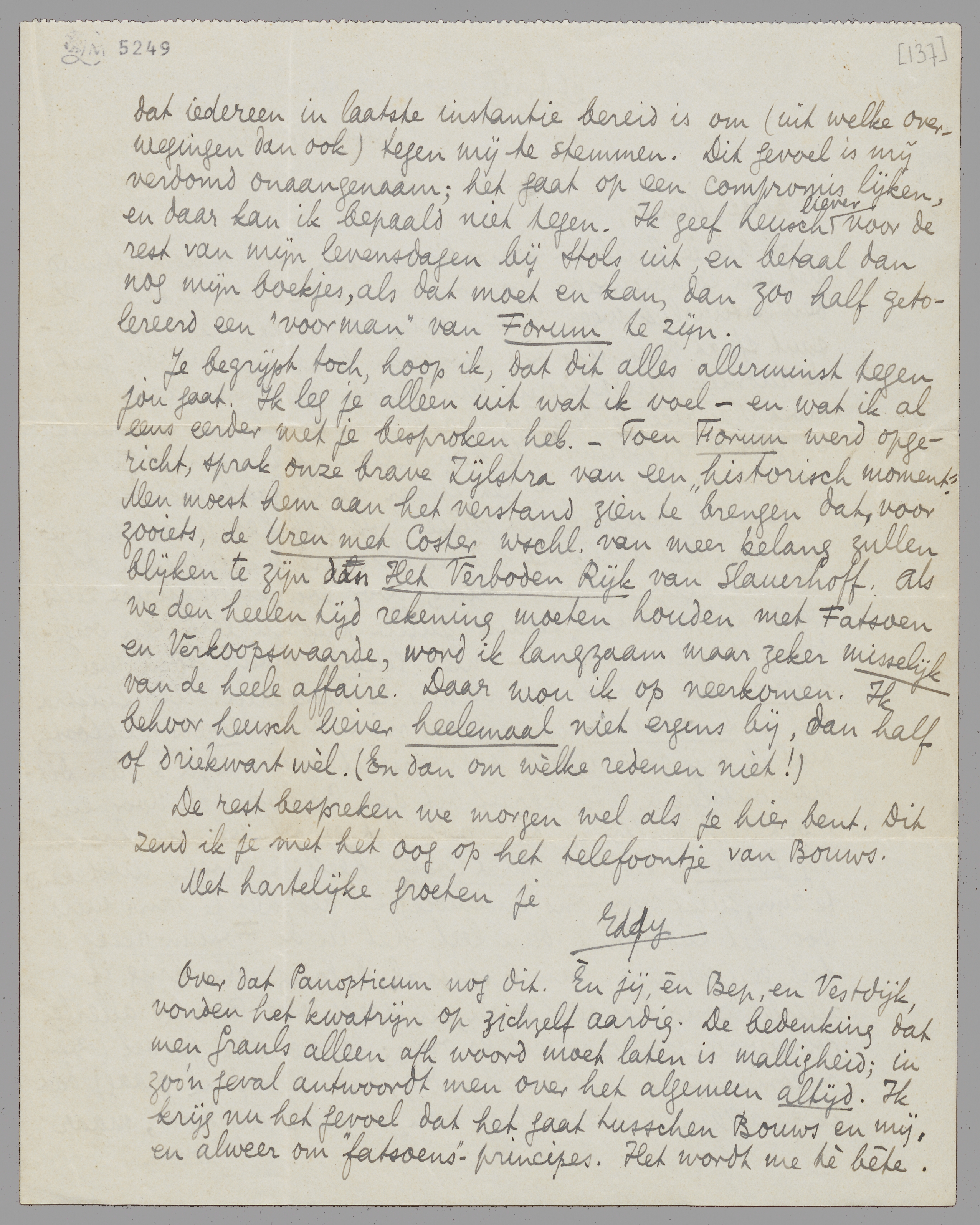 Maar de oorzaak ligt dieper. Ik heb het je al eens gezegd: van het begin af heb ik den indruk gekregen dat ik voor Zijlstra, voor Bouws, voor jou en Maurice zelfs waar het ‘algemeen belang’ jullie preoccupeert, een ongewenscht element ben - niet geheel, maar toch wel ergens. Dit gevoel begint mij te hinderen. Als Zijlstra wèl je Démasqué uitgeeft en niet mijn Uren met Coster acht ik mij van iedere solidariteit met Nijgh & Van Ditmar ontslagen. (Ik schreef dit aan Bouws). En voor een groot deel verlies ik dan ook het gevoel van te hooren bij Forum. De Uren met Coster heetten vroeger uitstekend te zijn, juist voor ons ensemble; en als het te lang werd voor het tijdschrift, dan leek het in de Forum-reeks toch een nummer van kapitaal belang. Nu krijg ik allerlei ‘condities’ te hooren, en heeft ook Bouws allerlei ‘commercieele inzichten’ er over; ik heb het gevoel (zéér oncommercieel en onverstandig, dat geloof ik graag) dat ik alleen met een deel van mijzelf bij Forum hoor, maar dat iedereen in laatste instantie bereid is om (uit welke overwegingen dan ook) tegen mij te stemmen. Dit gevoel is mij verdomd onaangenaam; het gaat op een compromis lijken, en daar kan ik bepaald niet tegen. Ik geef heusch liever voor de rest van mijn levensdagen bij Stols uit, en betaal dan nog mijn boekjes, als dat moet en kan, dan zoo half getolereerd een ‘voorman’ van Forum te zijn.