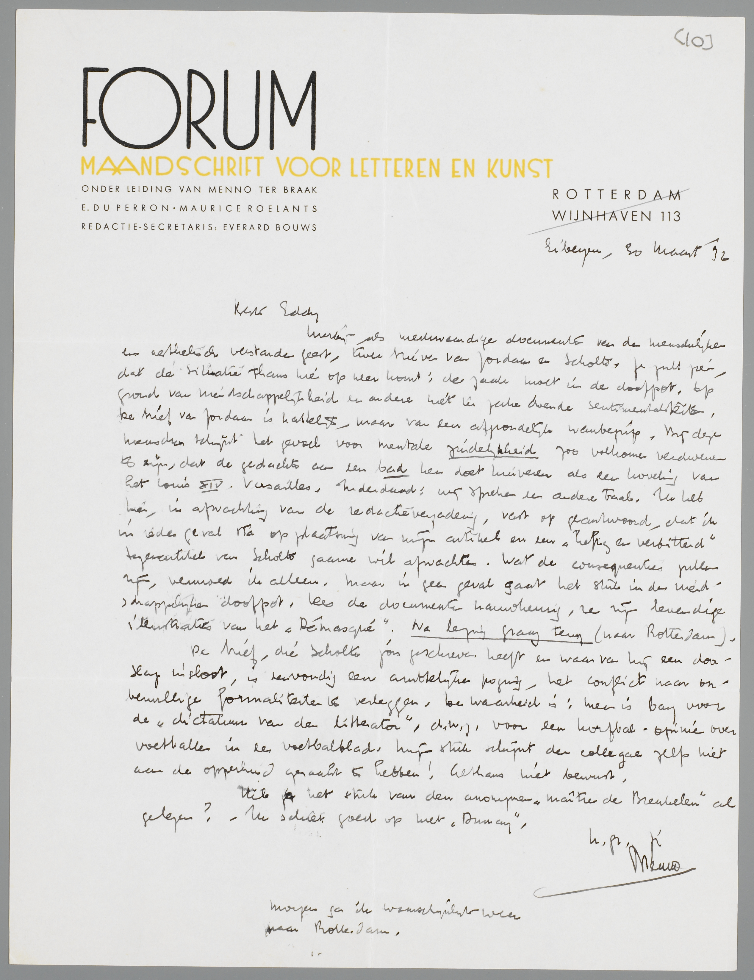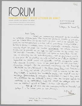 Hierbij als merkwaardige documenten van den menschelijken en aesthetisch verstarden geest, twee brieven van Jordaan en Scholte. Je zult zien, dat de situatie thans hier op neer komt: de zaak moet in de doofpot. Op grond van vriendschappelijkheid en andere niet ter zake doende sentimentaliteiten. De brief van Jordaan is hartelijk, maar van een afgrondelijk wanbegrip. Bij deze menschen schijnt het gevoel voor mentale zindelijkheid zoo volkomen verdweenen te zijn, dat een gedachte aan een bad hen doet huiveren als een hoveling van het Louis XIV Versailles. Inderdaad: wij spreken een andere taal. Ik heb hier, in afwachting van de redactievergadering, vast op geantwoord, dat ik in ieder geval sta op plaatsing van mijn artikel en een ‘heftig en verbitterd’ tegenartikel van Scholte gaarne wil afwachten. Wat de consequenties zullen zijn, vermoed ik alleen. Maar in geen geval gaat het stuk in den vriendschappelijken doofpot. Lees de documenten nauwkeurig, ze zijn levendige illustraties van het Démasqué. Na lezing graag terug (naar Rotterdam).