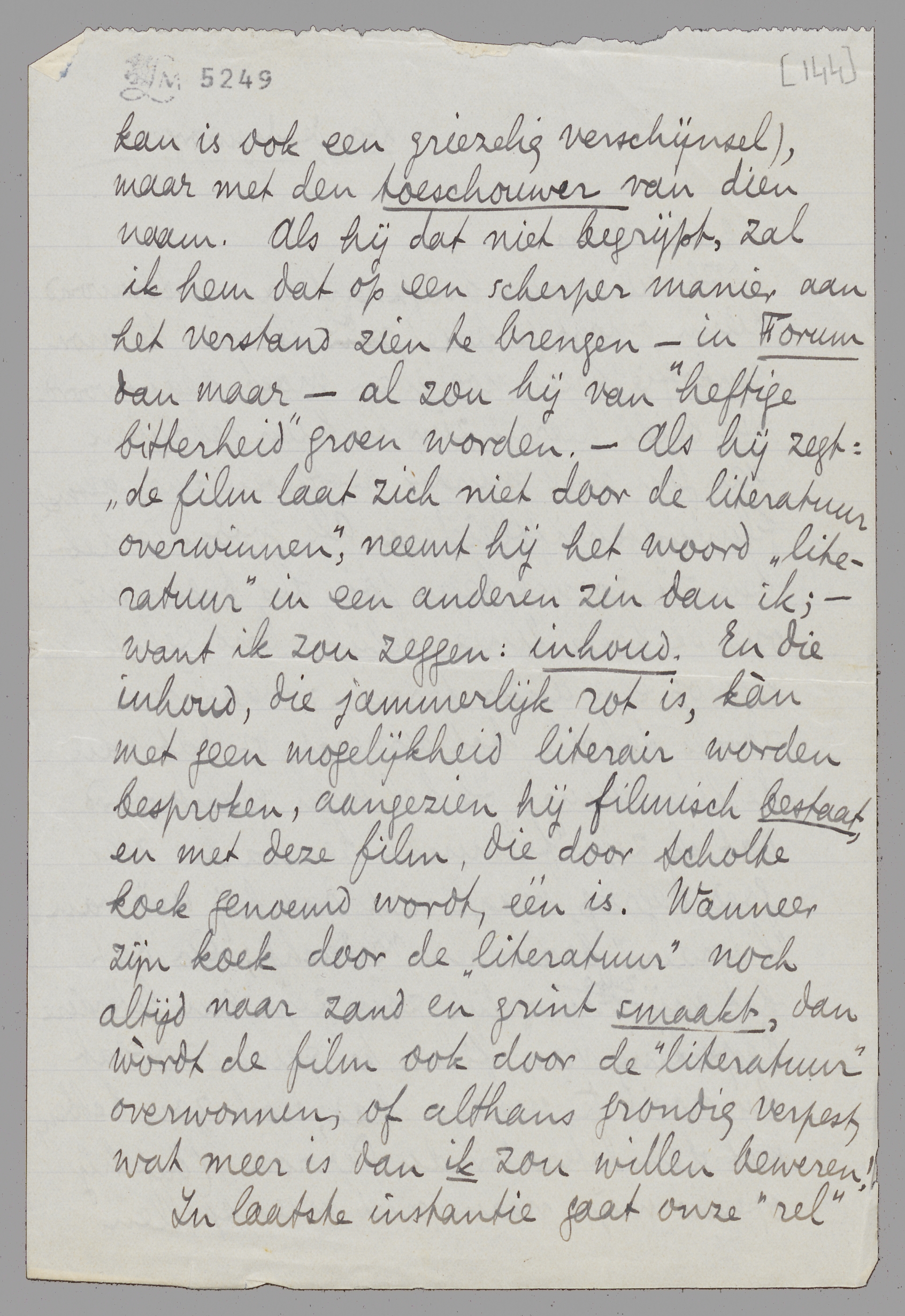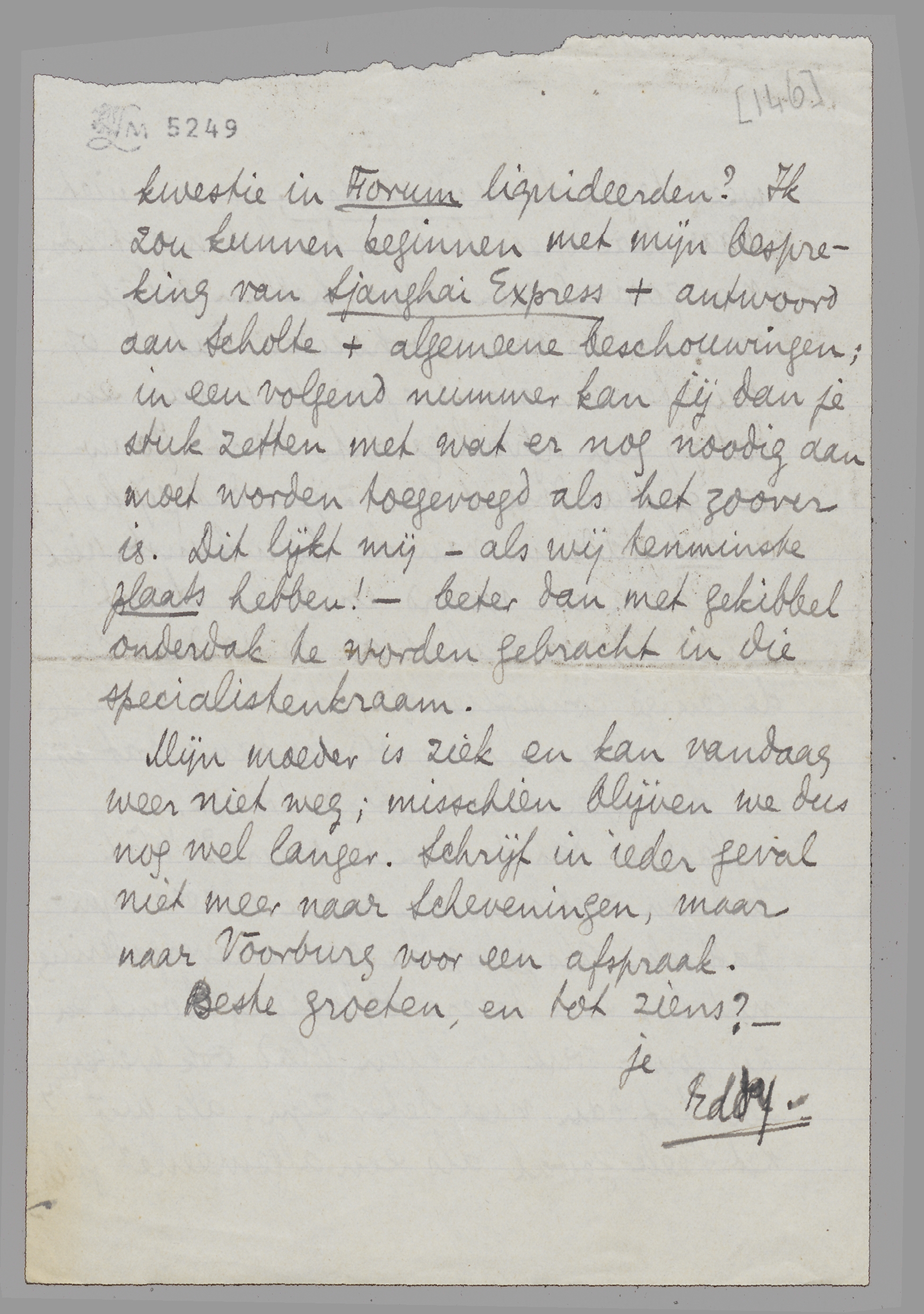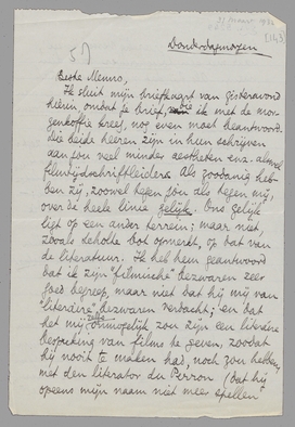 Maar is dat de moeite waard? Wat Jordaan zegt van die ruzie is zeer sympathiek. Als je op de redactievergadering niet tot een betere oplossing komt en zij jouw stuk in hun blad ook weigeren, zou het dan niet beter zijn, als wij het heele geval als een ‘algemeene’ filmkwestie in Forum liquideerden? Ik zou kunnen beginnen met mijn bespreking van Sjanghai Express + antwoord aan Scholte + algemeene beschouwingen; in een volgend nummer kan jij dan je stuk zetten met wat er nog noodig aan moet worden toegevoegd als het zoover is. Dit lijkt mij-als wij tenminste plaats hebben! - beter dan met gekibbel onderdak te worden gebracht in die specialistenkraam.