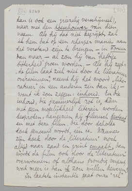 Ik sluit mijn briefkaart van gisteravond hierin, omdat je brief, die ik met de morgenkoffie kreeg, nog even moet beantwoord. Die beide heeren zijn in hun schrijven aan jou veel minder aestheten enz. alswel filmtijdschriftleiders. Als zoodanig hebben zij, zoowel tegen jou als tegen mij, over de heele linie gelijk. Ons gelijk ligt op een ander terrein; maar niet, zooals Scholte bot opmerkt, op dat van de literatuur. Ik heb hem geantwoord dat ik zijn ‘filmische’ bezwaren zeer goed begreep, maar niet dat hij mij van ‘literaire’ bezwaren verdacht; en dat het mij zelfs onmogelijk zou zijn een literaire bespreking van films te geven, zoodat hij nooit te maken had, noch zou hebben met den literator du Perron (dat hij opeens mijn naam niet meer spellen kan is ook een griezelig verschijnsel), maar met den toeschouwer van dien naam. Als hij dat niet begrijpt, zal ik hem dat op een scherper manier aan het verstand zien te brengen - in Forum dan maar - al zou hij van ‘heftige bitterheid’ groen worden. - Als hij zegt: ‘de film laat zich niet door de literatuur overwinnen’, neemt hij het woord ‘literatuur’ in een anderen zin dan ik; - want ik zou zeggen: inhoud. En die inhoud, die jammerlijk rot is, kàn met geen mogelijkheid literair worden besproken, aangezien hij filmisch bestaat, en met deze film, die door Scholte koek genoemd wordt, één is. Wanneer zijn koek door de ‘literatuur’ nog altijd naar zand en grint smaakt, dan wòrdt de film ook door de ‘literatuur’ overwonnen, of althans grondig verpest, wat meer is dan ik zou willen beweren!