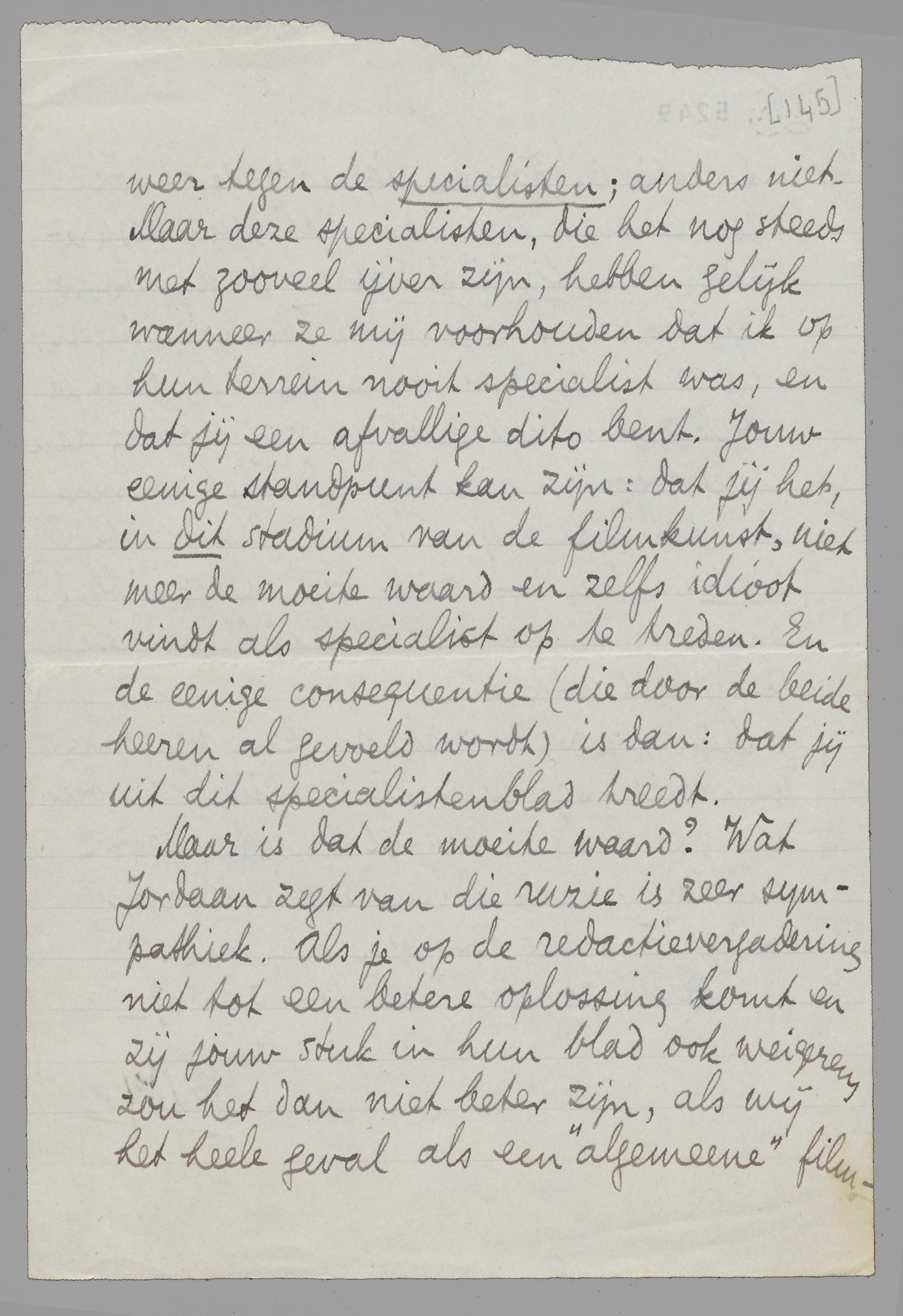 In laatste instantie gaat onze ‘rel’ weer tegen de specialisten; anders niet. Maar deze specialisten, die het nog steeds met zooveel ijver zijn, hebben gelijk wanneer ze mij voorhouden dat ik op hun terrein nooit specialist was, en dat jij een afvallige dito bent. Jouw eenige standpunt kan zijn: dat jij het, in dit stadium van de filmkunst, niet meer de moeite waard en zelfs idioot vindt als specialist op te treden. En de eenige consequentie (die door de beide heeren al gevoeld wordt) is dan: dat jij uit dit specialistenblad treedt.