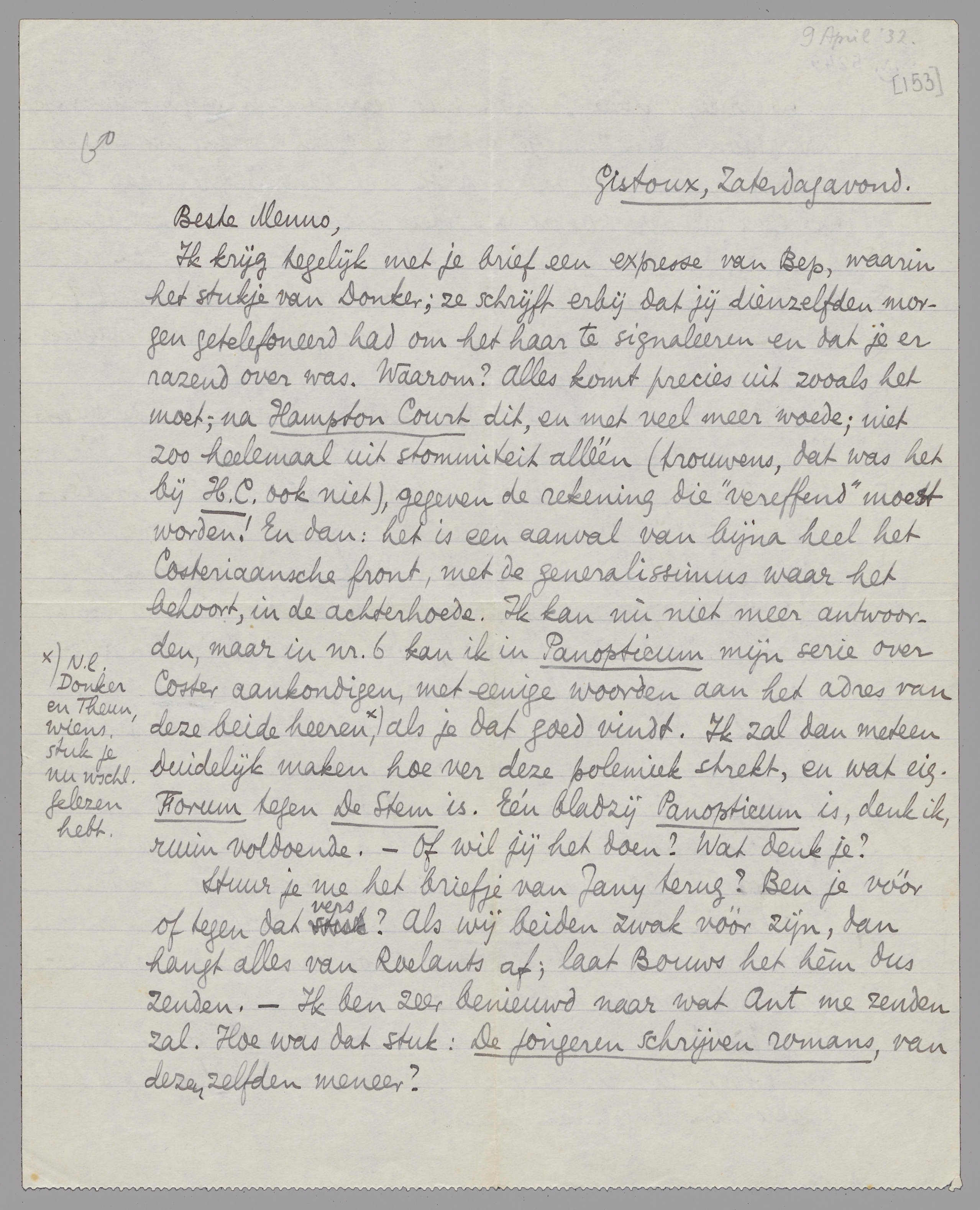 Ik krijg tegelijk met je brief een expresse van Bep, waarin het stukje van Donker; ze schrijft erbij dat jij dienzelfden morgen getelefoneerd had om het haar te signaleeren en dat je er razend over was. Waarom? Alles komt precies uit zooals het moet; na Hampton Court dit, en met veel meer woede; niet zoo heelemaal uit stommiteit alléén (trouwens, dat was het bij H.C. ook niet), gegeven de rekening die ‘vereffend’ moest worden! En dan: het is een aanval van bijna heel het Costeriaansche front, met de generalissimus waar het behoort, in de achterhoede. Ik kan nù niet meer antwoorden, maar in nr. 6 kan ik in Panopticum mijn serie over Coster aankondigen, met eenige woorden aan het adres van deze beide heeren*, als je dat goed vindt. Ik zal dan meteen duidelijk maken hoe ver deze polemiek strekt, en wat eig. Forum tegen de Stem is. Eén bladzij Panopticum is, denk ik, ruim voldoende. - Of wil jij het doen? Wat denk je?