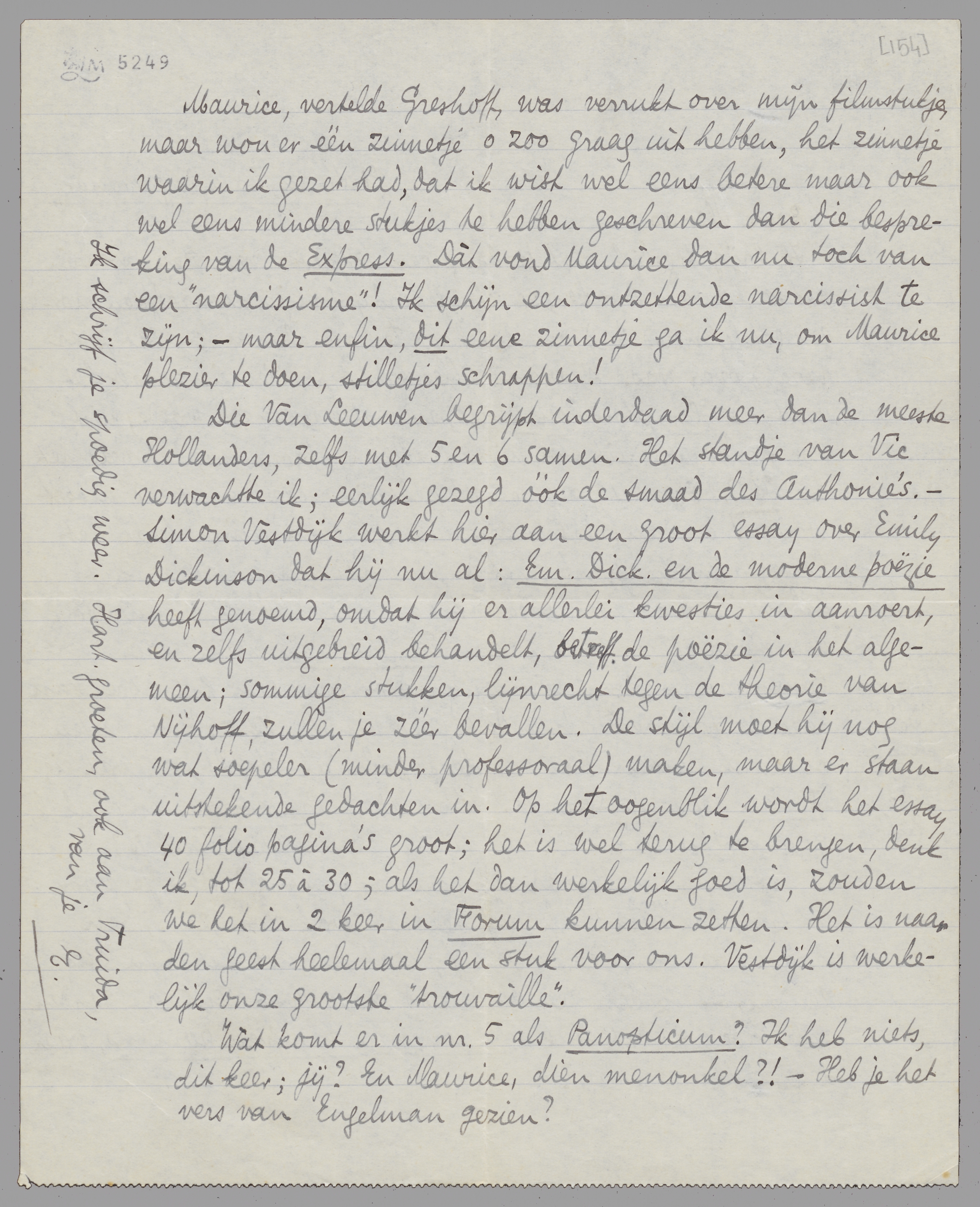 Maurice, vertelde Greshoff, was verrukt over mijn filmstukje, maar wou er één zinnetje o zoo graag uit hebben, het zinnetje waarin ik gezet had, dat ik wist wel eens betere maar ook wel eens mindere stukjes te hebben geschreven dan die bespreking van de Express. Dàt vond Maurice dan nu toch van een ‘narcissisme’! Ik schijn een ontzettende narcissist te zijn; - maar enfin, dit eene zinnetje ga ik nu, om Maurice plezier te doen, stilletjes schrappen!