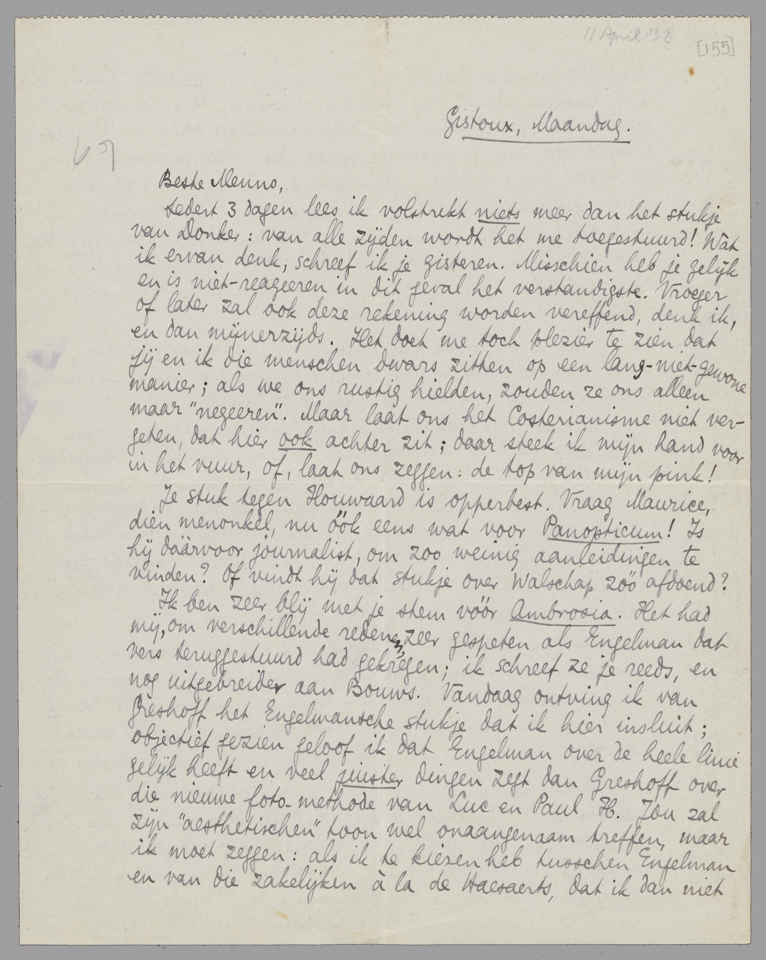 Ik ben zeer blij met je stem vóór Ambrosia. Het had mij, om verschillenden redenen, zeer gespeten als Engelman dat vers teruggestuurd had gekregen; ik schreef ze je reeds, en nog uitgebreider aan Bouws. Vandaag ontving ik van Greshoff het Engelmansche stukje dat ik hier insluit; objectief gezien geloof ik dat Engelman over de heele linie gelijk heeft en veel juister dingen zegt dan Greshoff over die nieuwe foto-methode van Luc en Paul H. Jou zal zijn ‘aesthetischen’ toon wel onaangenaam treffen, maar ik moet zeggen: als ik te kiezen heb tusschen Engelman en van die zakelijken à la de Haesaerts, dat ik dan niet lang aarzel, er is heusch een verschil van gehalte. Liever een ‘aestheet’, die op vele punten mee kan, dan die extramoderne half-industrieelen, waarvan Ehrenbourg en Feuchtwanger voor mij de afschrikwekkendste specimina zijn (ook al omdat bijna iedereen erin vliegt.) - Je had in je stuk over Lawrence-Huxley nog kunnen zetten dat een oppositie als deze alleen op één plan van belang is, zooals trouwens door de persoonlijke verhouding L.-H. werd aangegeven; dat met het omhoog blazen van L. ten koste van H., of andersom, de vergissing en de stommiteit beginnen.