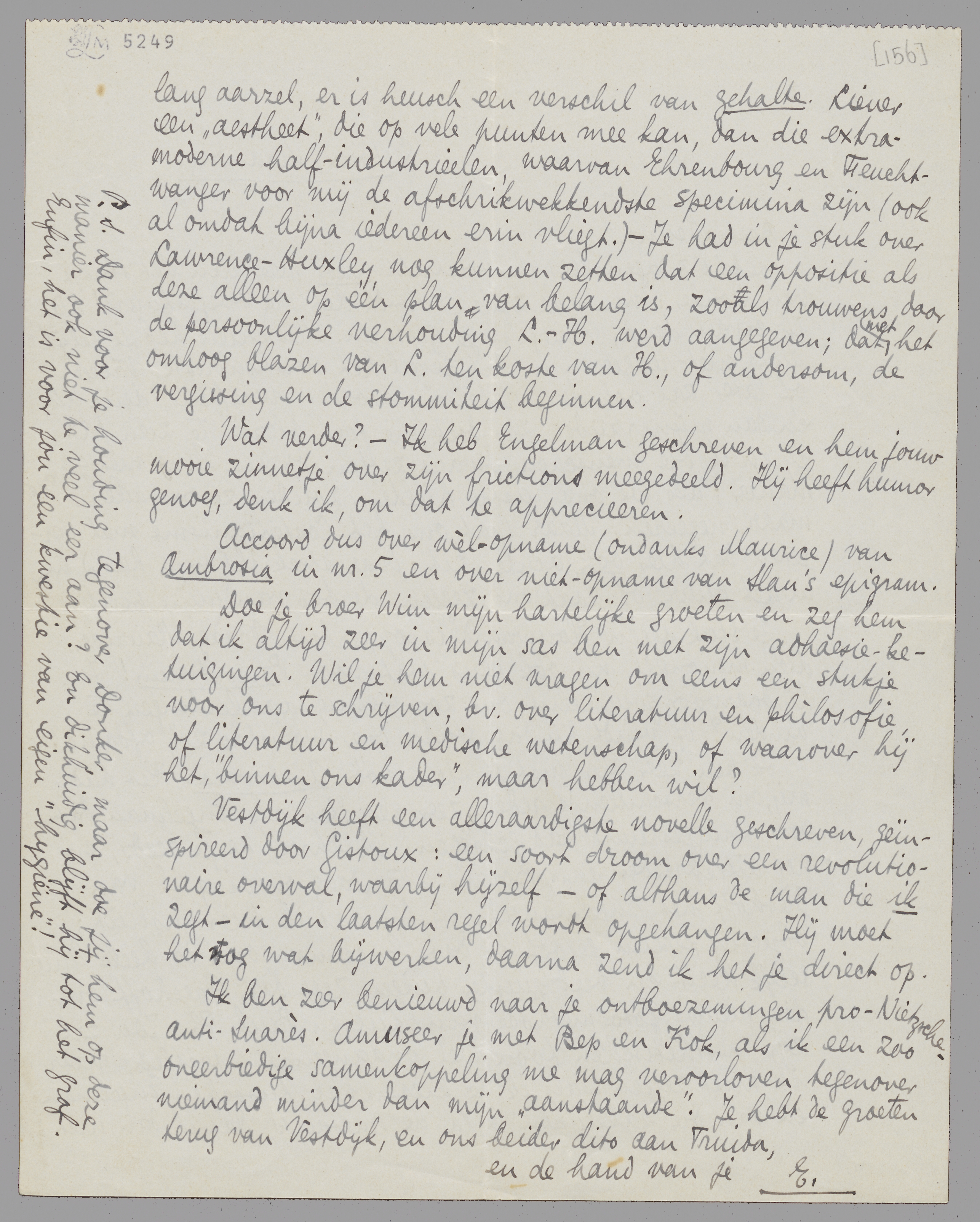 Doe je broer Wim mijn hartelijke groeten en zeg hem dat ik altijd zeer in mijn sas ben met zijn adhaesie-betuigingen. Wil je hem niet vragen om eens een stukje voor ons te schrijven, bv. over literatuur en philosofie, of literatuur en medische wetenschap, of waarover hij het, ‘binnen ons kader’, maar hebben wil? Vestdijk heeft een alleraardigste novelle geschreven, geinspireerd door Gistoux: een soort droom over een revolutionaire overval, waarbij hijzelf- of althans de man die ik zegt - in den laatsten regel wordt opgehangen. Hij moet het nog wat bijwerken, daarna zend ik het je direct op.