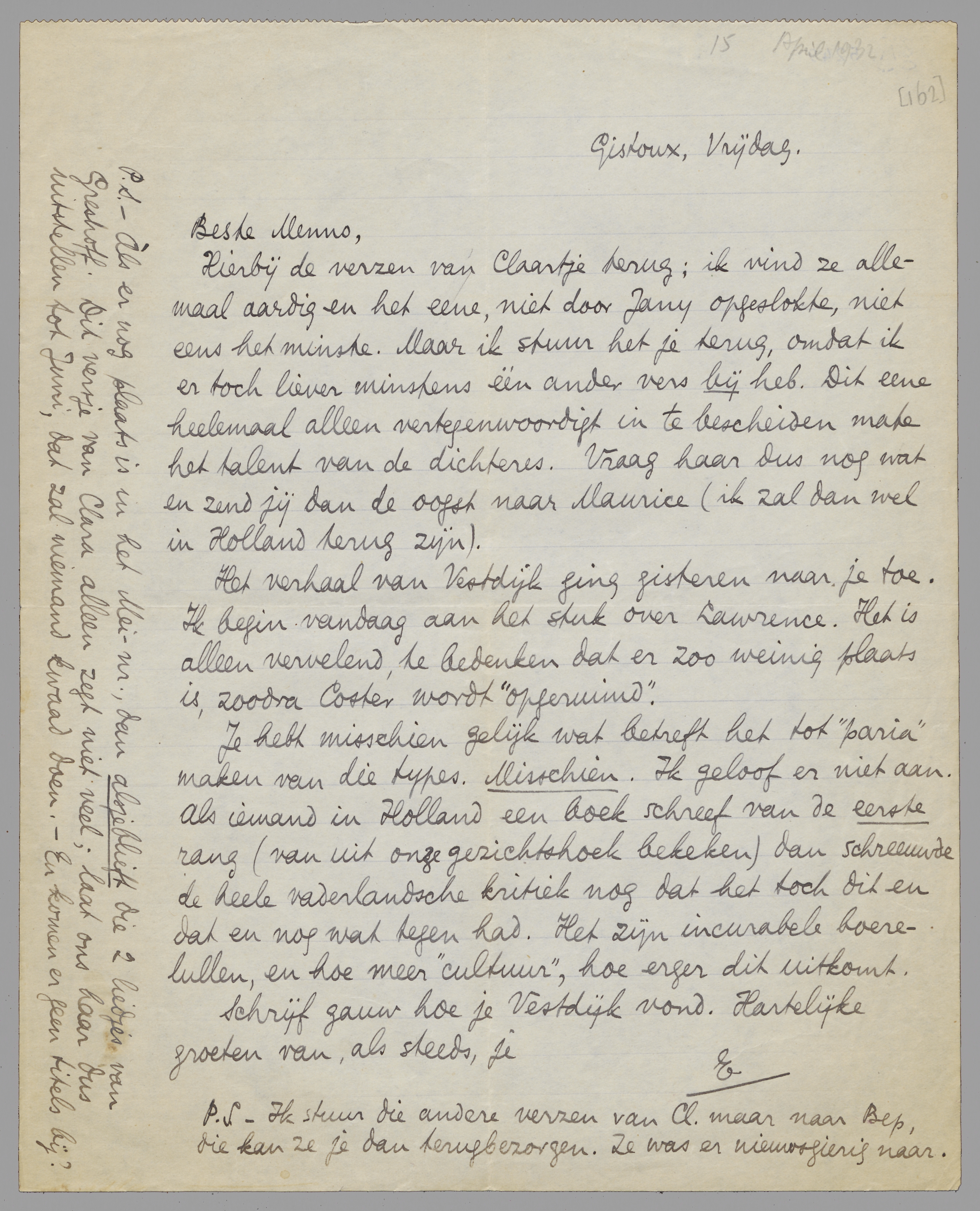 P.S. - Ik stuur die andere verzen van Cl. maar naar Bep, die kan ze je dan terugbezorgen. Ze was er nieuwsgierig naar.