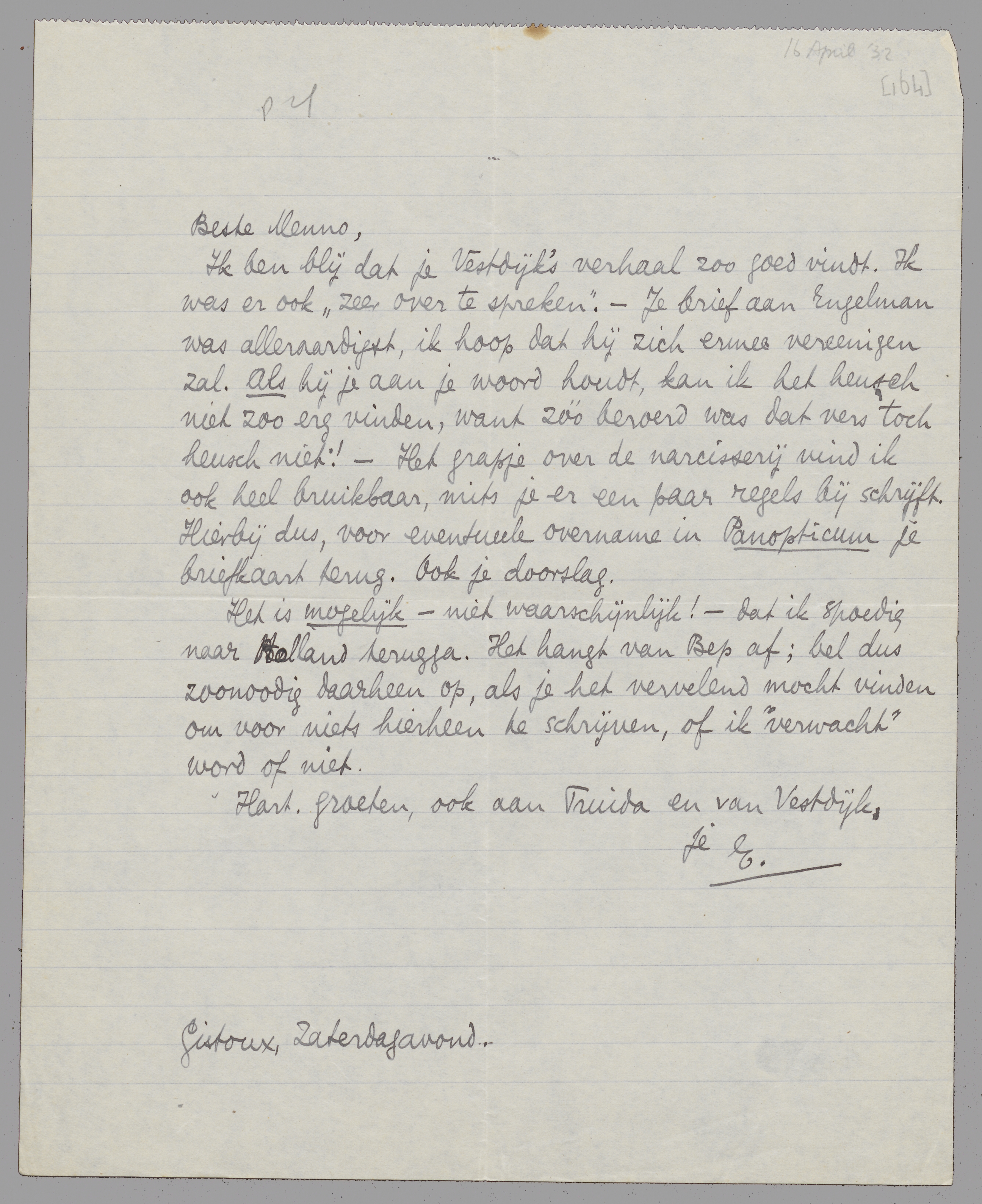 Ik ben blij dat je Vestdijk's verhaal zoo goed vindt. Ik was er ook ‘zeer over te spreken’. - Je brief aan Engelman was alleraardigst, ik hoop dat hij zich ermee vereenigen zal. Als hij je aan je woord houdt, kan ik het heusch niet zo erg vinden, want zóó beroerd was dat vers toch heusch niet! - Het grapje over de narcisserij vind ik ook heel bruikbaar, mits je er een paar regels bij schrijft. Hierbij dus, voor eventueele overname in Panopticum je briefkaart terug. Ook je doorslag.
