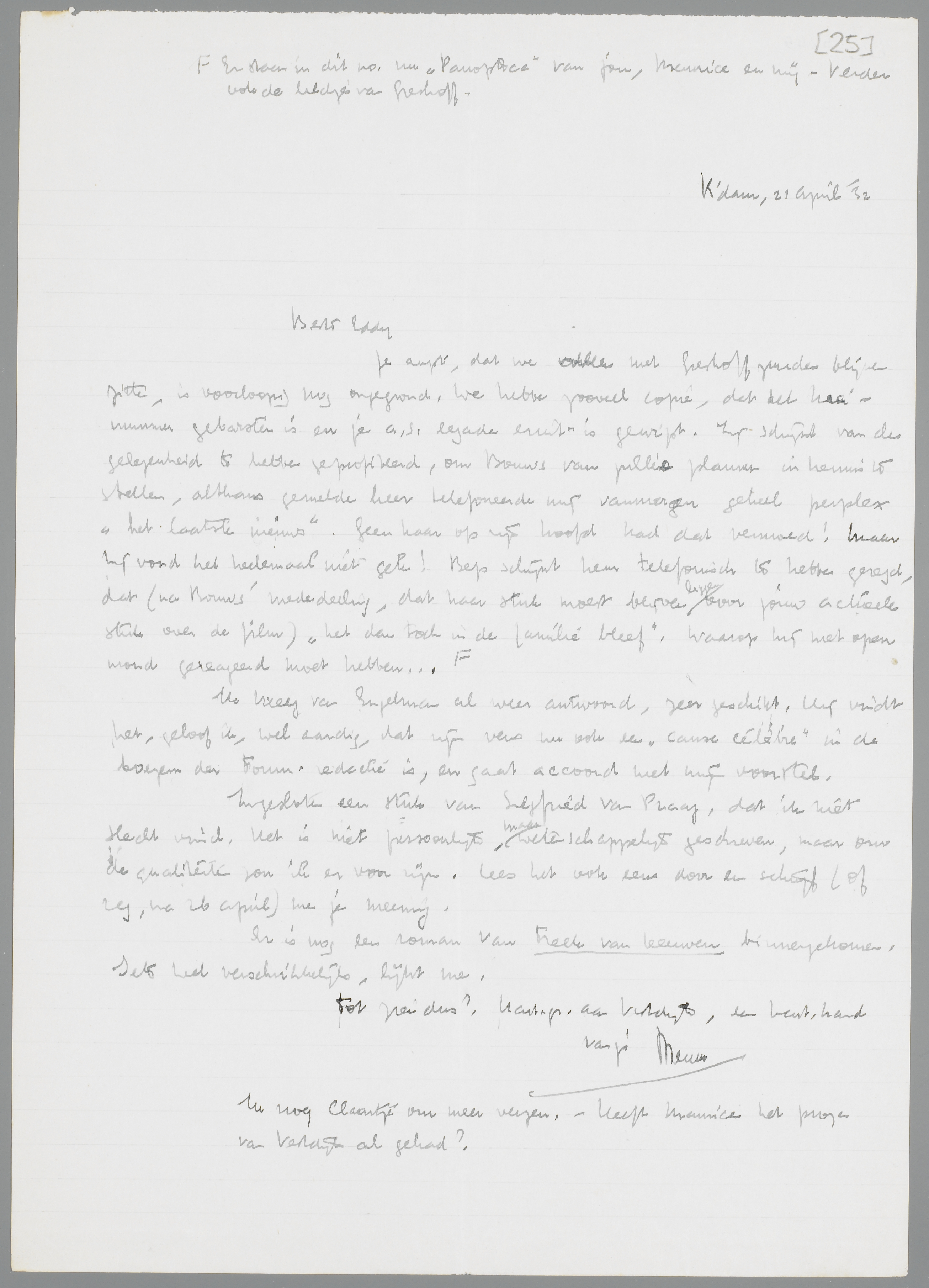 Je angst, dat we alleen met Greshoff zouden blijven zitten, is voorloopig nog ongegrond. We hebben zooveel copie, dat het Mei-nummer gebarsten is en je a.s. eegade eruit is gewipt. Zij schijnt van die gelegenheid te hebben geprofiteerd, om Bouws van jullie plannen in kennis te stellen, althans gemelde heer telefoneerde mij vanmorgen geheel perplex ‘het laatste nieuws’. Geen haar op zijn hoofd had dat vermoed! Maar hij vond het heelemaal niet gek! Bep schijnt hem telefonisch te hebben gezegd, dat (na Bouws' mededeeling, dat haar stuk moest blijven liggen voor jouw actueele stuk over de film) ‘het dan toch in de familie bleef’. Waarop hij met open mond gereageerd moet hebben*...