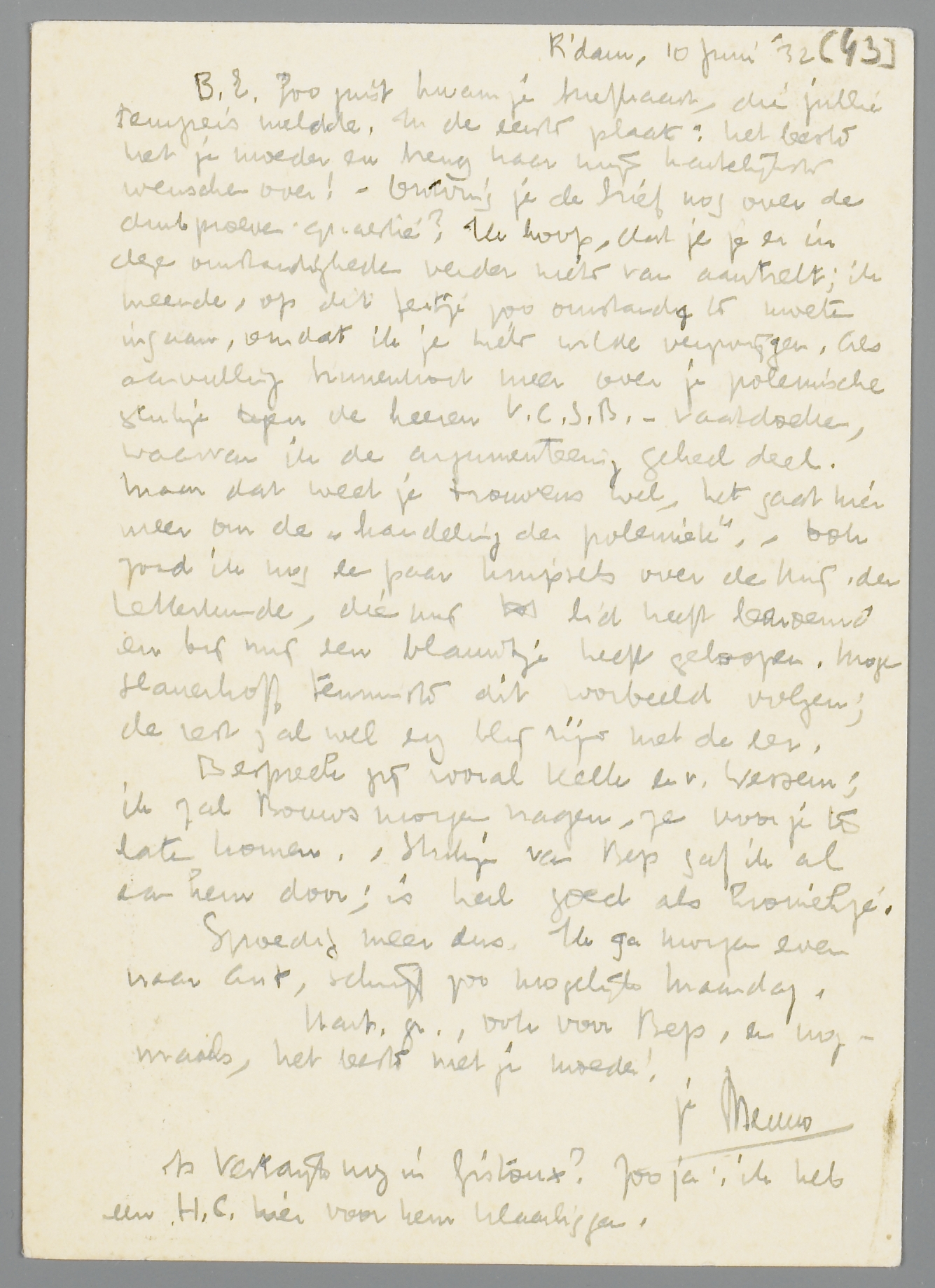 Zoo juist kwam je briefkaart, die jullie terugreis meldde. In de eerste plaats: het beste met je moeder en breng haar mijn hartelijkste wenschen over! - Ontving je de brief nog over de drukproeven-quaestie? Ik hoop, dat je je er in deze omstandigheden verder niets van aantrekt; ik meende, op dit feitje zoo omstandig te moeten ingaan, omdat ik je niets wilde verzwijgen. Als aanvulling binnenkort meer over je polemische stukje tegen de heeren V.C.S.B.-vaatdoeken, waarvan ik de argumenteering geheel deel. Maar dat weet je trouwens wel, het gaat hier meer om de ‘handeling der polemiek’. - Ook zond ik nog een paar knipsels over de Mij der Letterkunde, die mij tot lid heeft benoemd en bij mij een blauwtje heeft geloopen. Moge Slauerhoff tenminste dit voorbeeld volgen; de rest zal wel erg blij zijn met de eer.
