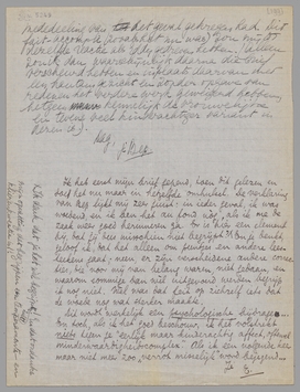 Dat je dus razend was op mij: jij, die hier zoo weinig mee te maken had, begrijp ik dus gewoon niet. Je zoekt te veel van wantrouwen, etc. in mijn reacties. Er is één ding dat ik verdomd vervelend vind, maar meer ook niet, in ons ‘team’: dat principe van contrôle; niet van kritiek. Dàt zal dan mijn minderw. complex zijn, maar het heeft niets te maken met die misselijkheid van mij te tracteeren op een halfverbeterde tekst. Het Forum-nr. is voor mij bedorven, zooals ik Bouws schreef; daarmee uit. Een volgend maal prefereer ik mijn extra-correctie te betalen, dan nogmaals voor déze ‘kleinigheden’ te worden gezet, waar ik niet tegen kan.