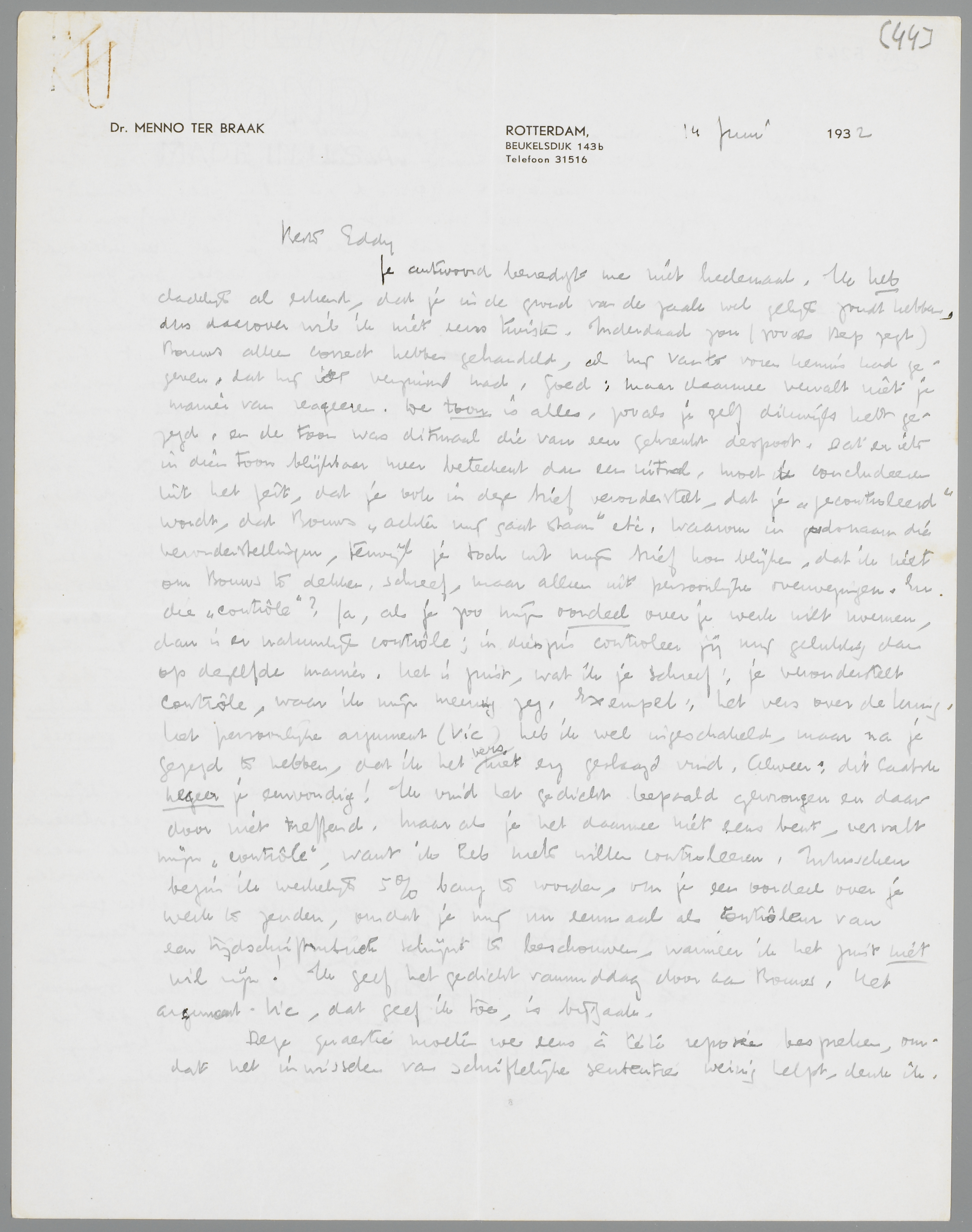 Je antwoord bevredigt me niet heelemaal. Ik heb dadelijk al erkend, dat je in de grond van de zaak wel gelijk zoudt hebben, dus daarover wil ik niet eens twisten. Inderdaad zou (zooals Bep zegt) Bouws alleen correct hebben gehandeld, als hij van te voren kennis had gegeven, dat hij iets verzuimd had. Goed: maar daarmee vervalt niet je manier van reageeren. De toon is alles, zooals je zelf dikwijls hebt gezegd, en de toon was ditmaal die van een gekrenkt despoot. Dat er iets in dien toon blijkbaar meer beteekent dan een uitval, moet ik concludeeren uit het feit, dat je ook in deze brief veronderstelt, dat je ‘gecontroleerd’ wordt, dat Bouws ‘achter mij gaat staan’ etc. Waarom in godsnaam die veronderstellingen, terwijl je toch uit mijn brief kon blijken, dat ik niet om Bouws te dekken, schreef, maar alleen uit persoonlijke overwegingen. En die ‘contrôle’? Ja, als je zoo mijn oordeel over je werk wilt noemen, dan is er natuurlijk contrôle; in dien zin controleer jij mij gelukkig dan op dezelfde manier. Het is juist, wat ik je schreef: je veronderstelt contrôle, waar ik mijn meening zeg. Exempel: het vers over de Kring. Het persoonlijke argument (Vic) heb ik wel ingeschakeld, maar na je gezegd te hebben, dat ik het vers niet erg geslaagd vind. Alweer: dit laatste negeer je eenvoudig! Ik vind het gedicht bepaald gewrongen en daar door niet treffend. Maar als je het daarmee niet eens bent, vervalt mijn ‘contrôle’, want ik heb niets willen controleeren. Intusschen begin ik werkelijk 5% bang te worden, om je een oordeel over je werk te zenden, omdat je mij nu eenmaal als contrôleur van een tijdschriftrubriek schijnt te beschouwen, wanneer ik het juist niet wil zijn! Ik geef het gedicht vanmiddag door aan Bouws. Het argument-Vic, dat geef ik toe, is bijzaak.