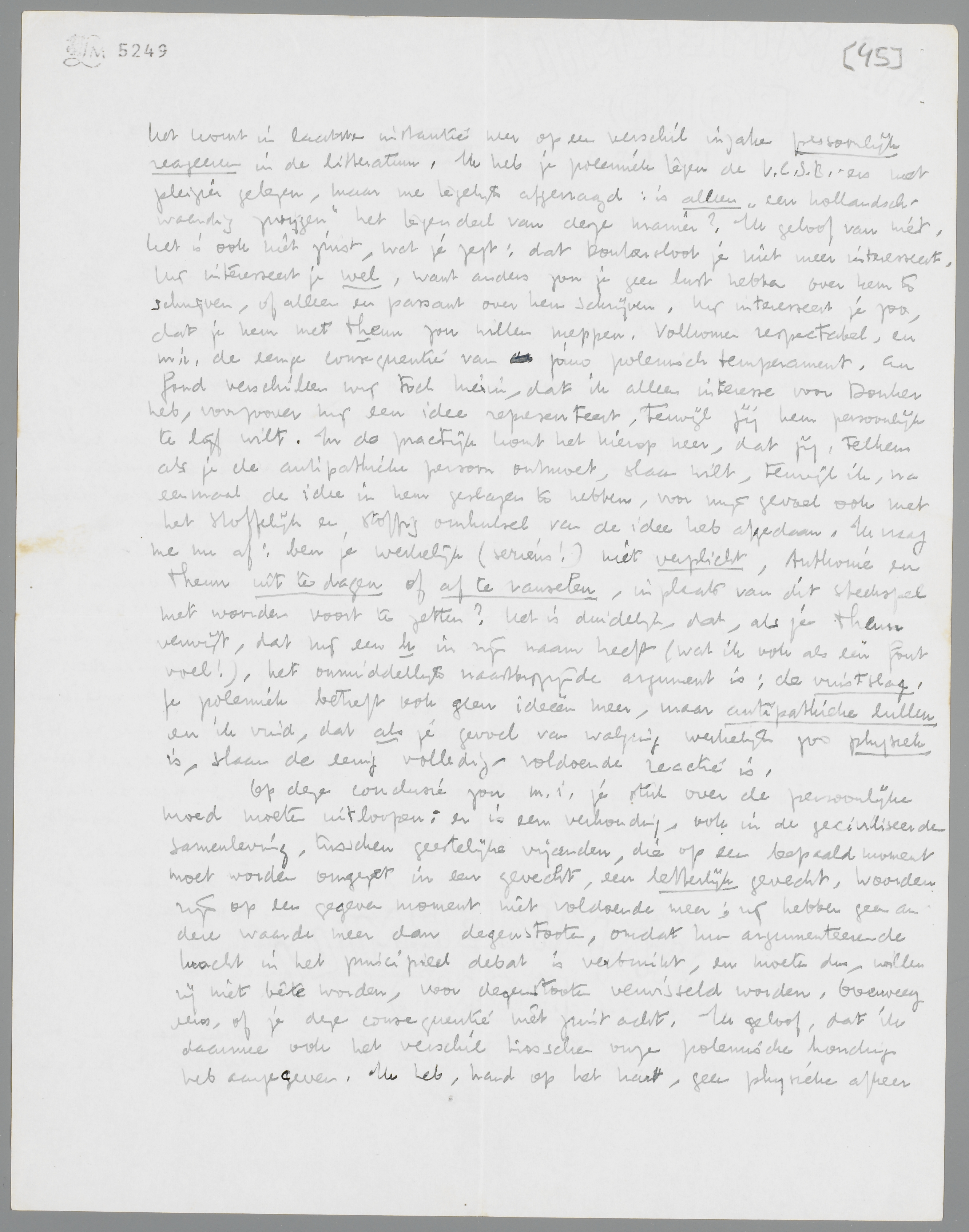 Deze quaestie moeten we eens à tête reposée bespreken, omdat het inwisselen van schriftelijke sententies weinig helpt, denk ik. Het komt in laatste instantie neer op een verschil inzake persoonlijk reageeren in de litteratuur. Ik heb je polemiek tegen de V.C.S.B.-ers met pleizier gelezen, maar me tegelijk afgevraagd: is alleen ‘een hollandsch-waardig zwijgen’ het tegendeel van deze manier? Ik geloof van niet. Het is ook niet juist, wat je zegt: dat Donkersloot je niet meer interesseert. Hij interesseert je wel, want anders zou je geen lust hebben over hem te schrijven, of alleen en passant over hem schrijven. Hij interesseert je zoo, dat je hem met Theun zou willen meppen. Volkomen respectabel, en m.i. de eenige consequentie van jouw polemisch temperament. Au fond verschillen wij toch hierin, dat ik alleen interesse voor Donker heb, voorzoover hij een idee representeert, terwijl jij hem persoonlijk te lijf wilt. In de practijk komt het hierop neer, dat jij, telkens als je de antipathieke persoon ontmoet, slaan wilt, terwijl ik, na eenmaal de idee in hem geslagen te hebben, voor mijn gevoel ook met het stoffelijk en stoffig omhulsel van de idee heb afgedaan. Ik vraag me nu af: ben je werkelijk (serieus!) niet verplicht, Anthonie en Theun uit te dagen of af te ranselen, in plaats van dit steekspel met woorden voort te zetten? Het is duidelijk, dat, als je Theun verwijt, dat hij een h in zijn naam heeft (wat ik ook als een fout voel!), het onmiddellijk naastbijzijnde argument is: de vuistslag. Je polemiek betreft ook geen ideeën meer, maar antipathieke lullen en ik vind, dat als je gevoel van walging werkelijk zoo physiek is, slaan de eenig volledig-voldoende reactie is.