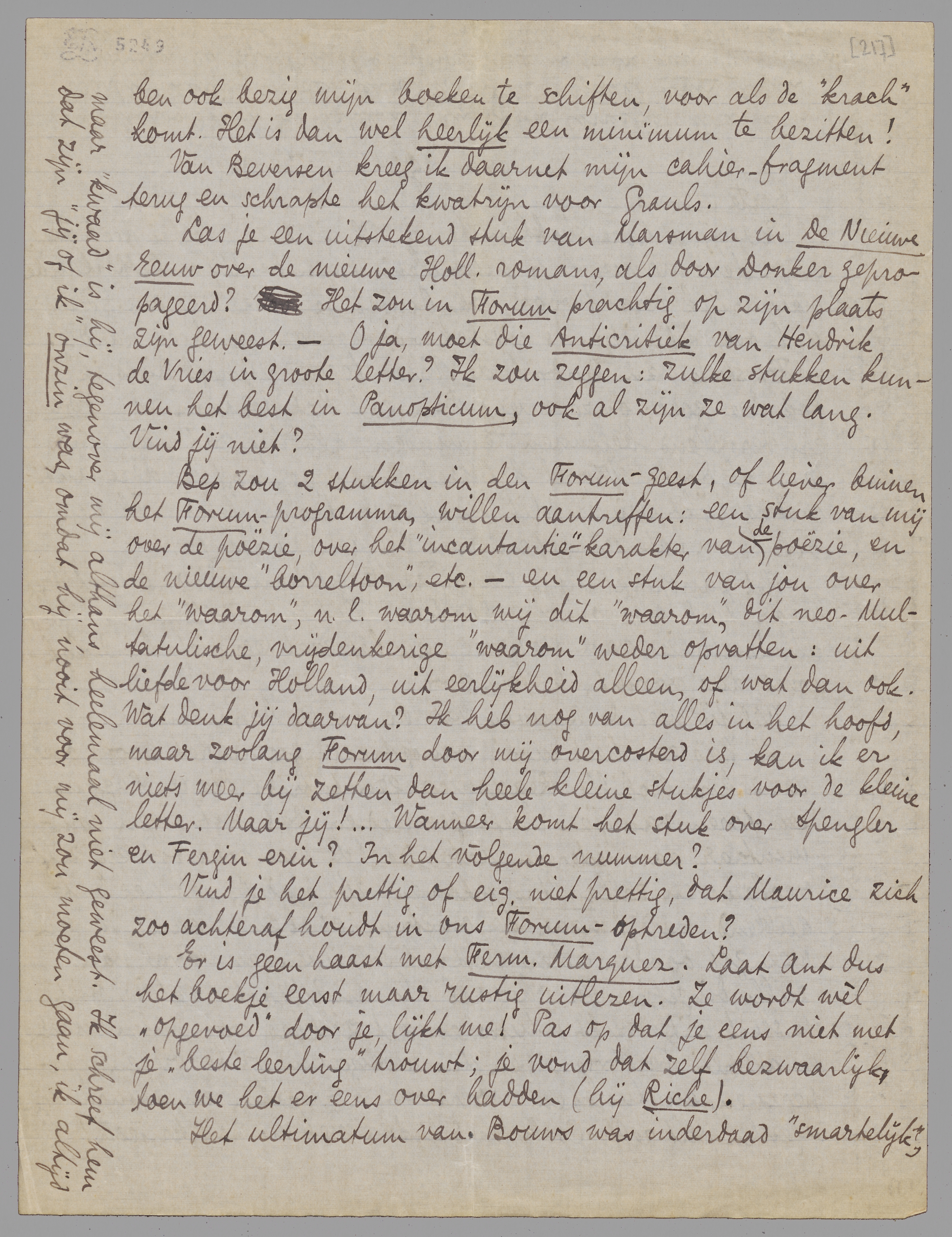 Bep zou 2 stukken in den Forum-geest, of liever binnen het Forum-programma willen aantreffen: een stuk van mij over de poëzie, over het ‘incantatie’-karakter van de poëzie, en de nieuwe ‘borreltoon,’ etc. - en een stuk van jou over het ‘waarom’, n.l. waarom wij dit ‘waarom’, dit neo-Multatulische, vrijdenkerige ‘waarom’ weder opvatten: uit liefde voor Holland, uit eerlijkheid alleen, of wat dan ook. Wat denk jij daarvan? Ik heb nog van alles in het hoofd, maar zoolang Forum door mij overcosterd is, kan ik er niets meer bij zetten dan heele kleine stukjes voor de kleine letter. Maar jij!... Wanneer komt het stuk over Spengler en Fergin erin? In het volgende nummer?
